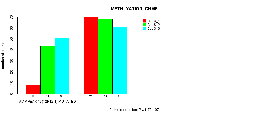 Amp Peak 19(12p12.1) cnvs correlated to 'CN_CNMF', 'METHLYATION_CNMF', 'MRNASEQ_CNMF', 'MRNASEQ_CHIERARCHICAL', 'MIRSEQ_CNMF', and 'MIRSEQ_CHIERARCHICAL'.