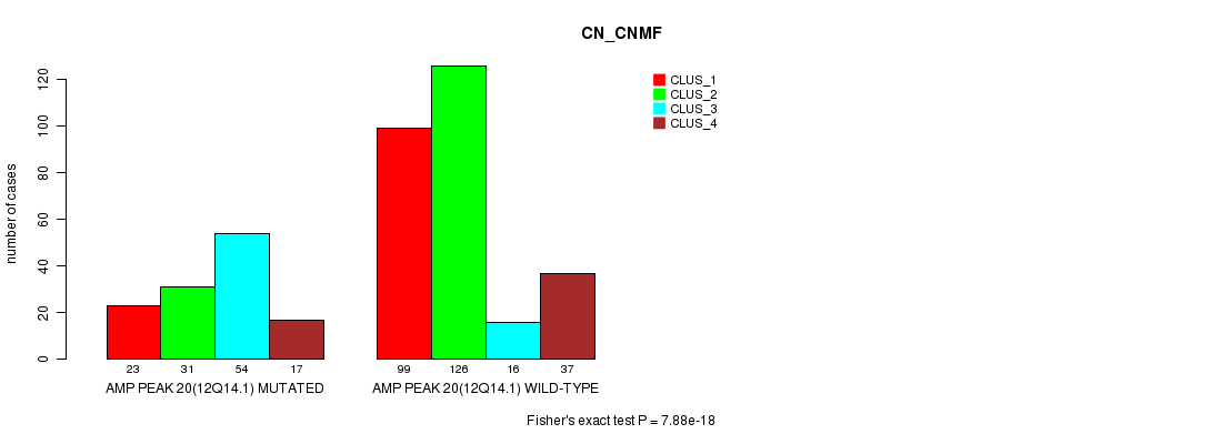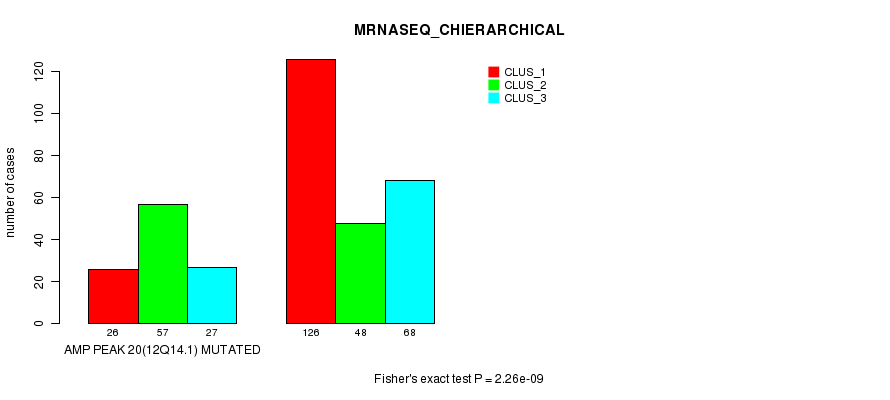 Amp Peak 20(12q14.1) cnvs correlated to 'CN_CNMF', 'METHLYATION_CNMF', 'MRNASEQ_CNMF', 'MRNASEQ_CHIERARCHICAL', 'MIRSEQ_CNMF', and 'MIRSEQ_CHIERARCHICAL'.