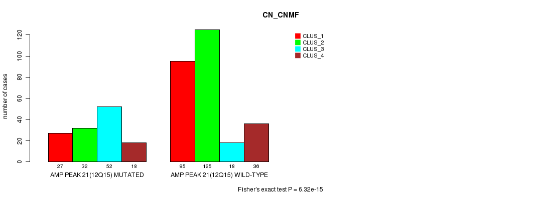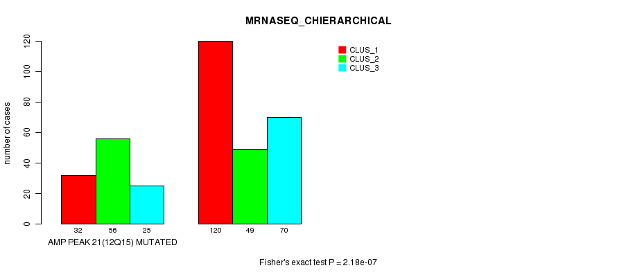 Amp Peak 21(12q15) cnvs correlated to 'CN_CNMF', 'METHLYATION_CNMF', 'MRNASEQ_CNMF', 'MRNASEQ_CHIERARCHICAL', 'MIRSEQ_CNMF', and 'MIRSEQ_CHIERARCHICAL'.