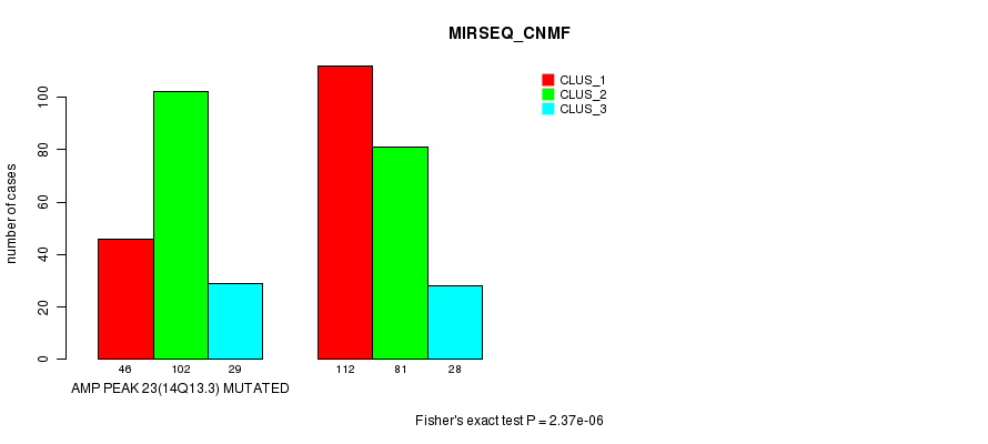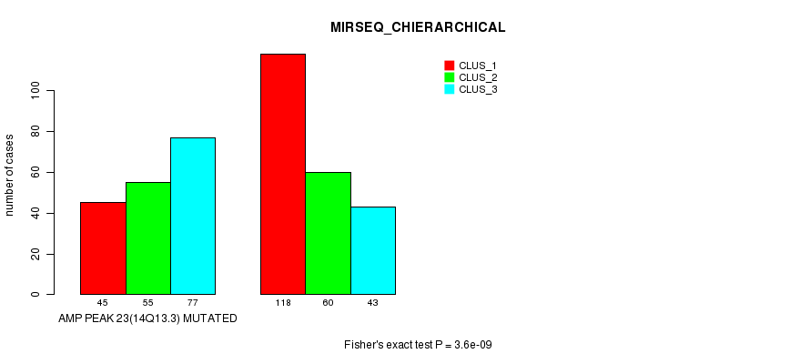 Amp Peak 23(14q13.3) cnvs correlated to 'CN_CNMF', 'METHLYATION_CNMF', 'MRNASEQ_CNMF', 'MRNASEQ_CHIERARCHICAL', 'MIRSEQ_CNMF', and 'MIRSEQ_CHIERARCHICAL'.