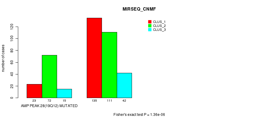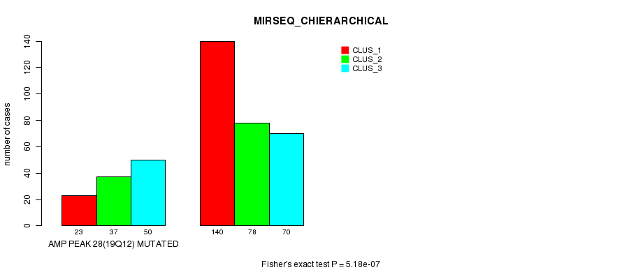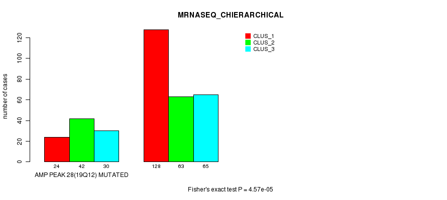 Amp Peak 28(19q12) cnvs correlated to 'CN_CNMF', 'MRNASEQ_CHIERARCHICAL', 'MIRSEQ_CNMF', and 'MIRSEQ_CHIERARCHICAL'.