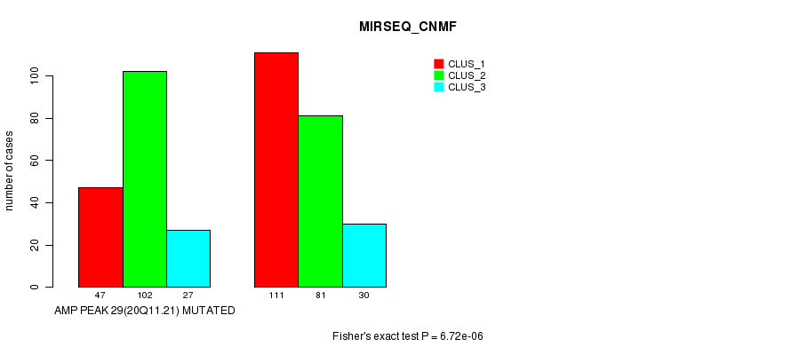 Amp Peak 29(20q11.21) cnvs correlated to 'CN_CNMF', 'MIRSEQ_CNMF', and 'MIRSEQ_CHIERARCHICAL'.