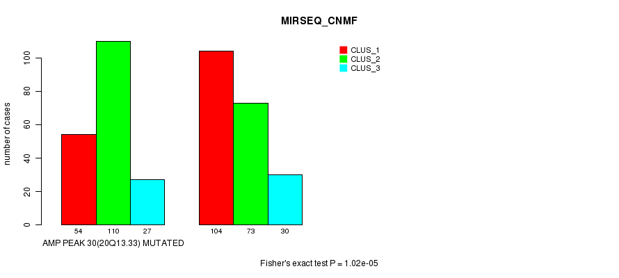 Amp Peak 30(20q13.33) cnvs correlated to 'CN_CNMF', 'MRNASEQ_CNMF', 'MIRSEQ_CNMF', and 'MIRSEQ_CHIERARCHICAL'.