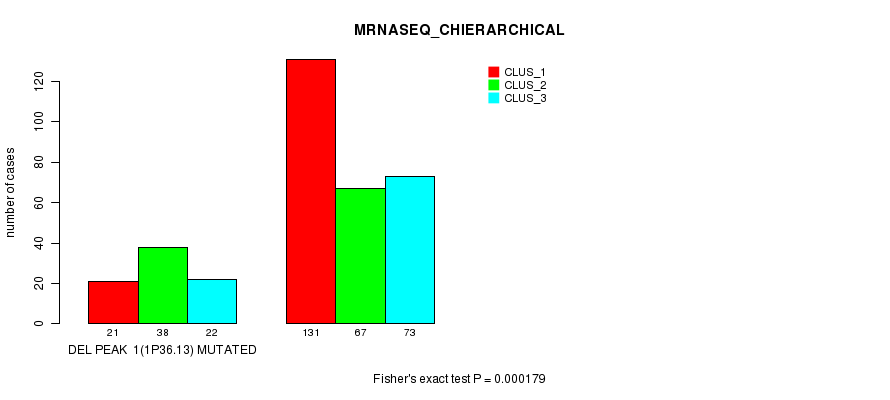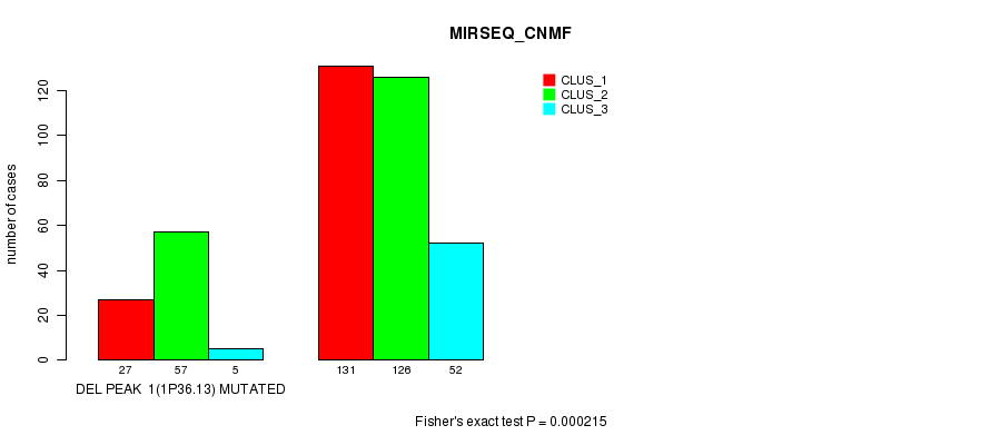 Del Peak 1(1p36.13) cnvs correlated to 'CN_CNMF', 'MRNASEQ_CNMF', 'MRNASEQ_CHIERARCHICAL', and 'MIRSEQ_CNMF'.
