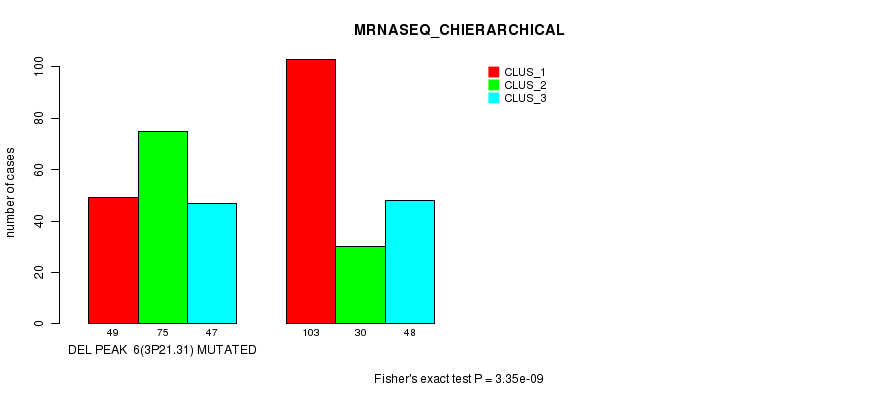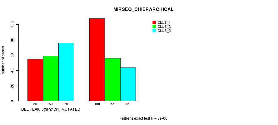 Del Peak 6(3p21.31) cnvs correlated to 'CN_CNMF', 'MRNASEQ_CHIERARCHICAL', 'MIRSEQ_CNMF', and 'MIRSEQ_CHIERARCHICAL'.