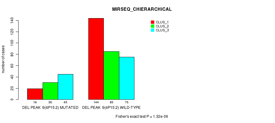 Table S246. Gene #75: 'Del Peak 43(21q11.2) mutation analysis' versus Clinical Feature #10: 'MIRSEQ_CHIERARCHICAL'