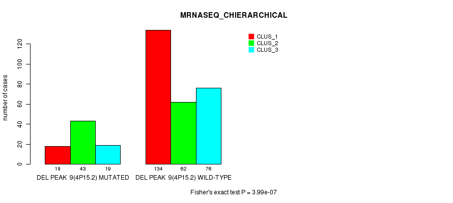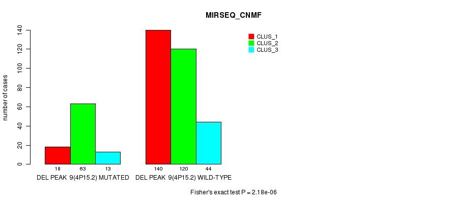 Del Peak 9(4p15.2) cnvs correlated to 'METHLYATION_CNMF', 'MRNASEQ_CNMF', 'MRNASEQ_CHIERARCHICAL', 'MIRSEQ_CNMF', and 'MIRSEQ_CHIERARCHICAL'.