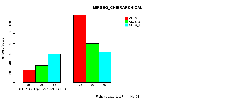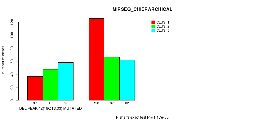 Figure S239. Get High-res Image Gene #74: 'Del Peak 42(19q13.33) mutation analysis' versus Clinical Feature #10: 'MIRSEQ_CHIERARCHICAL'