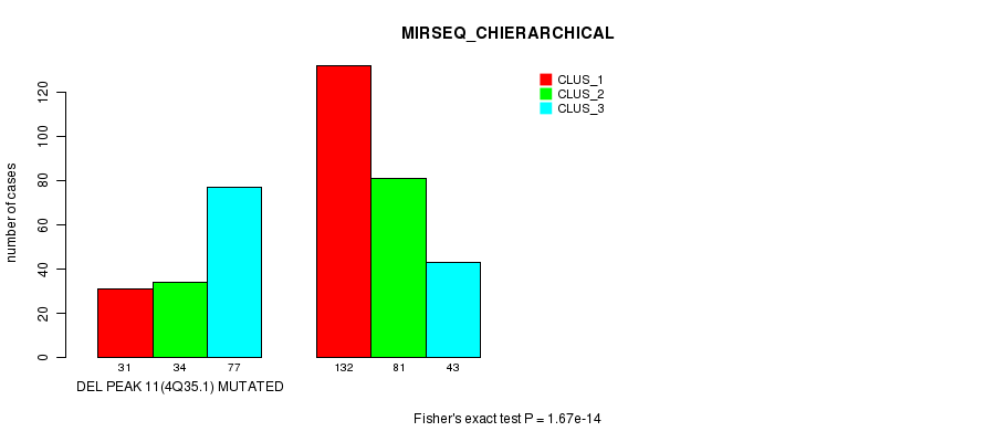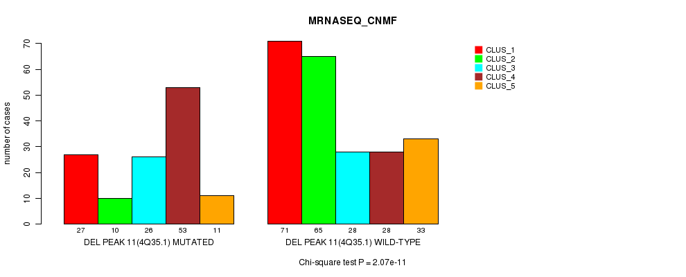 Del Peak 11(4q35.1) cnvs correlated to 'CN_CNMF', 'METHLYATION_CNMF', 'MRNASEQ_CNMF', 'MRNASEQ_CHIERARCHICAL', 'MIRSEQ_CNMF', and 'MIRSEQ_CHIERARCHICAL'.