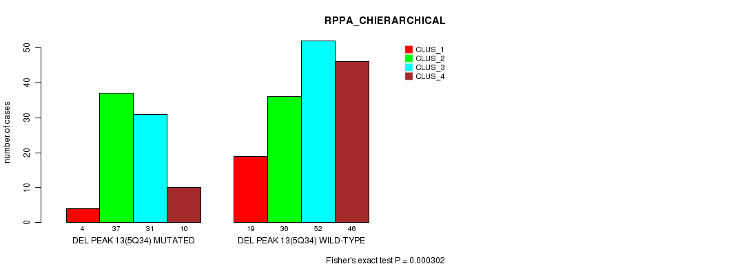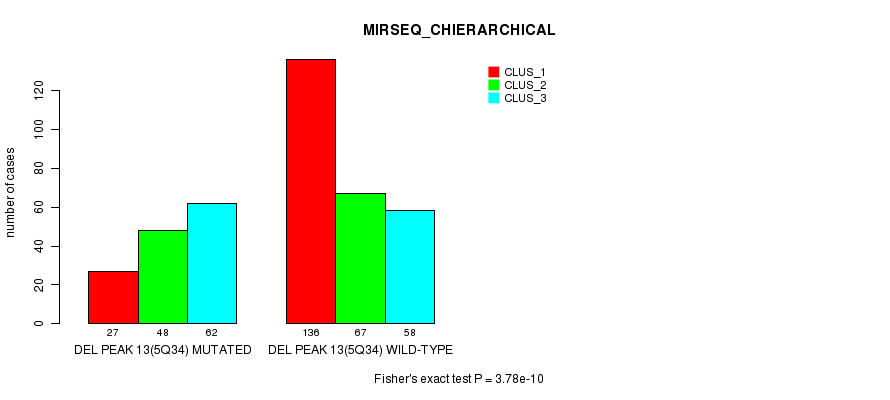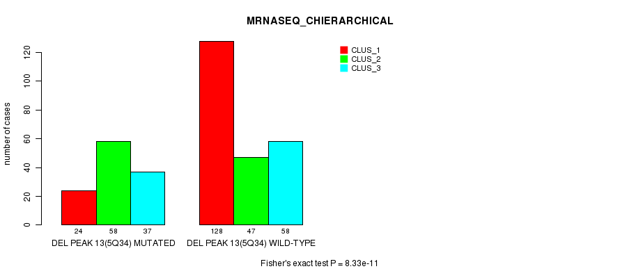 Del Peak 13(5q34) cnvs correlated to 'CN_CNMF', 'METHLYATION_CNMF', 'RPPA_CHIERARCHICAL', 'MRNASEQ_CNMF', 'MRNASEQ_CHIERARCHICAL', 'MIRSEQ_CNMF', and 'MIRSEQ_CHIERARCHICAL'.
