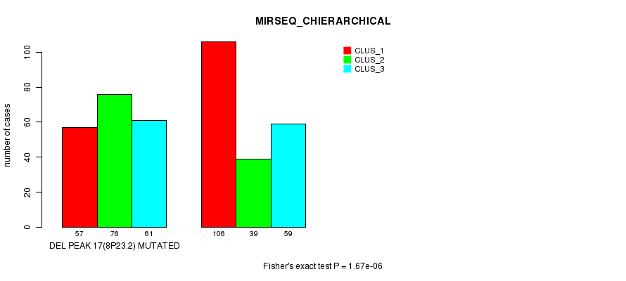 Del Peak 17(8p23.2) cnvs correlated to 'CN_CNMF', 'MRNASEQ_CNMF', 'MRNASEQ_CHIERARCHICAL', and 'MIRSEQ_CHIERARCHICAL'.