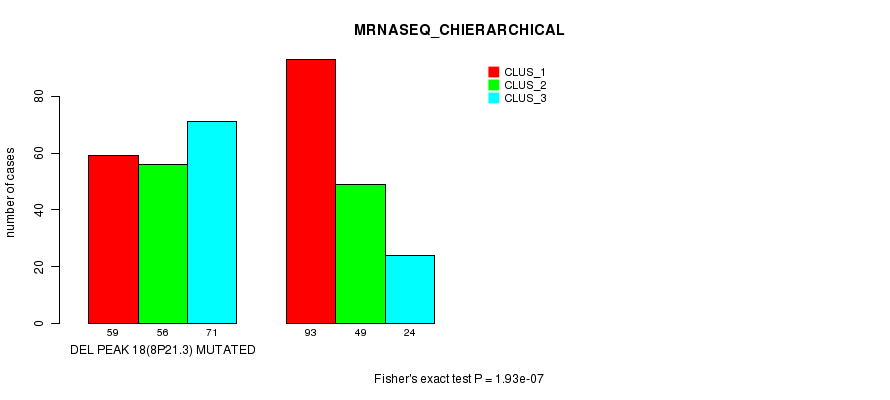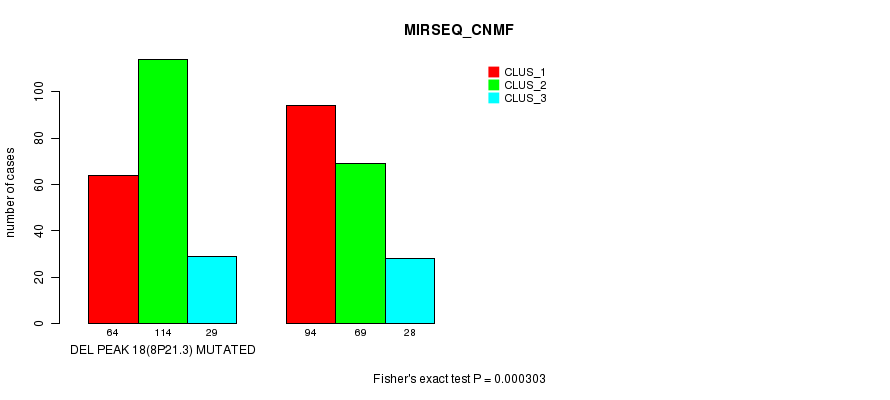 Del Peak 18(8p21.3) cnvs correlated to 'CN_CNMF', 'MRNASEQ_CNMF', 'MRNASEQ_CHIERARCHICAL', 'MIRSEQ_CNMF', and 'MIRSEQ_CHIERARCHICAL'.
