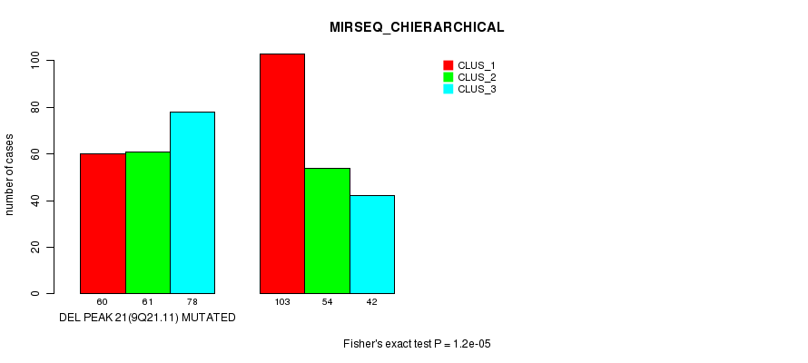 Del Peak 21(9q21.11) cnvs correlated to 'CN_CNMF', 'MRNASEQ_CHIERARCHICAL', and 'MIRSEQ_CHIERARCHICAL'.