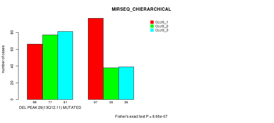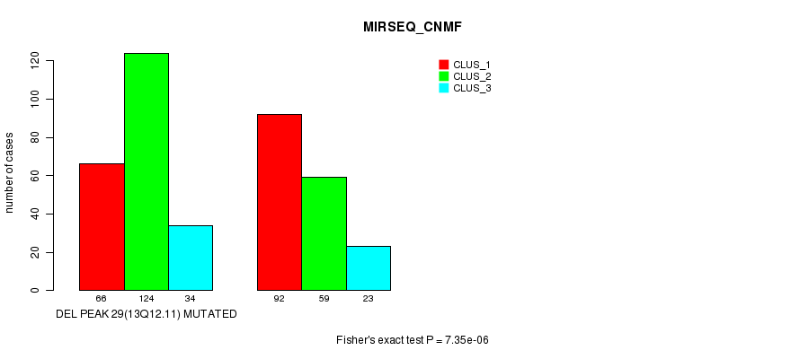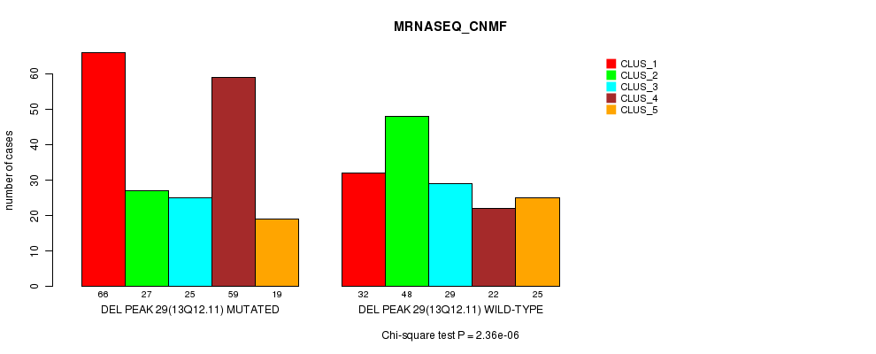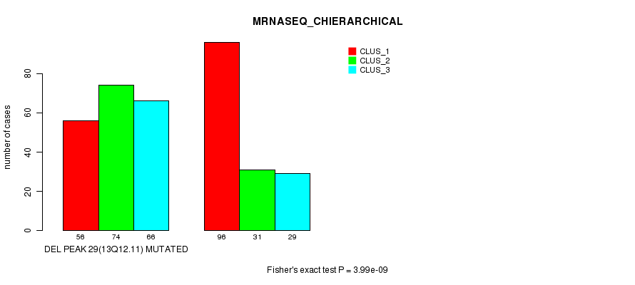 Del Peak 29(13q12.11) cnvs correlated to 'CN_CNMF', 'RPPA_CHIERARCHICAL', 'MRNASEQ_CNMF', 'MRNASEQ_CHIERARCHICAL', 'MIRSEQ_CNMF', and 'MIRSEQ_CHIERARCHICAL'.
