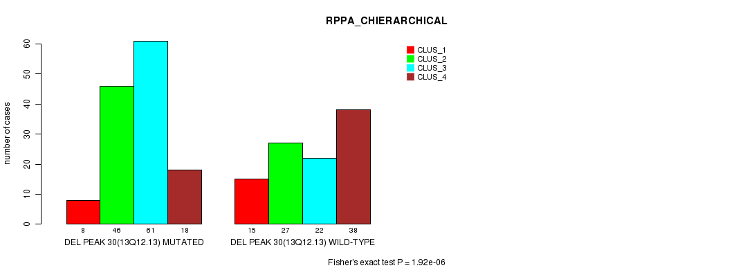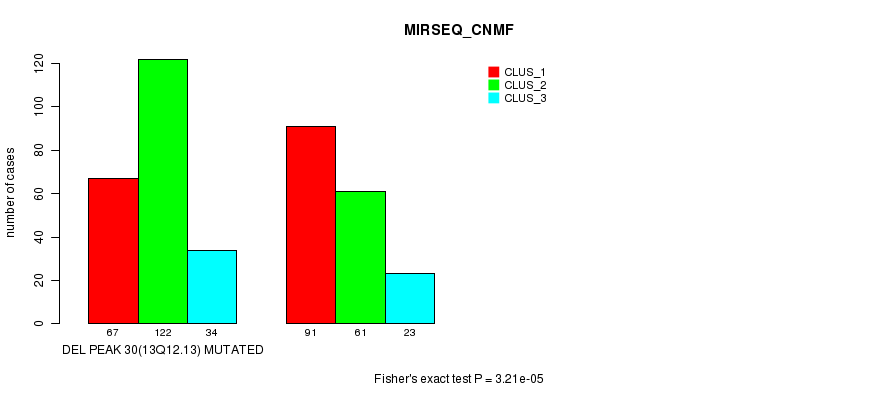 Del Peak 30(13q12.13) cnvs correlated to 'CN_CNMF', 'RPPA_CHIERARCHICAL', 'MRNASEQ_CNMF', 'MRNASEQ_CHIERARCHICAL', 'MIRSEQ_CNMF', and 'MIRSEQ_CHIERARCHICAL'.