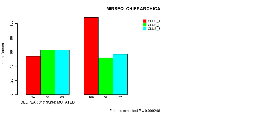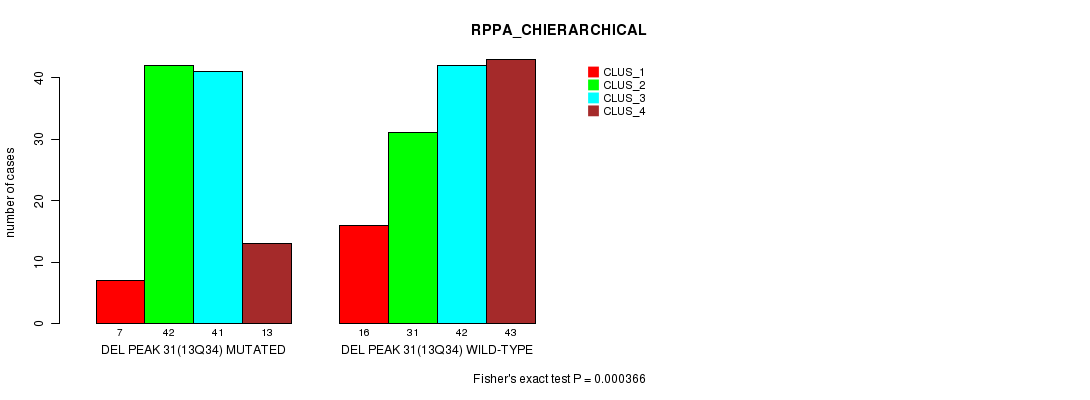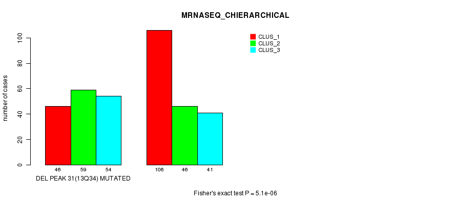 Del Peak 31(13q34) cnvs correlated to 'CN_CNMF', 'RPPA_CHIERARCHICAL', 'MRNASEQ_CNMF', 'MRNASEQ_CHIERARCHICAL', and 'MIRSEQ_CHIERARCHICAL'.