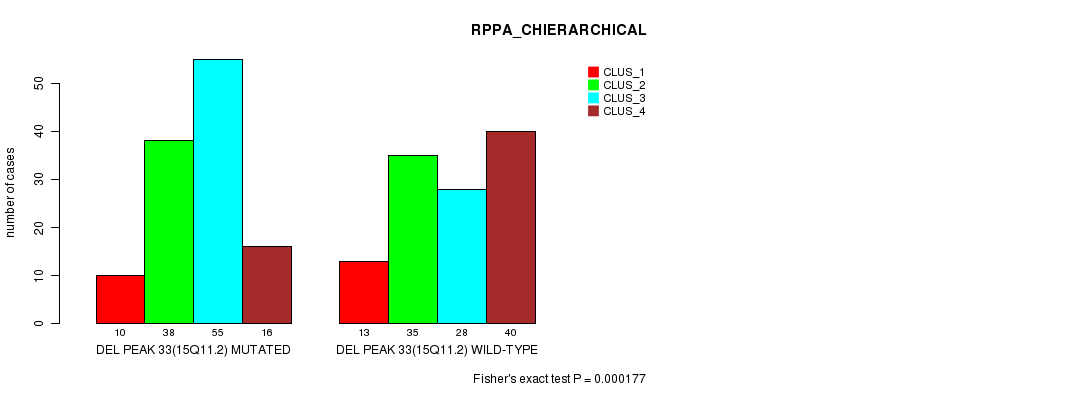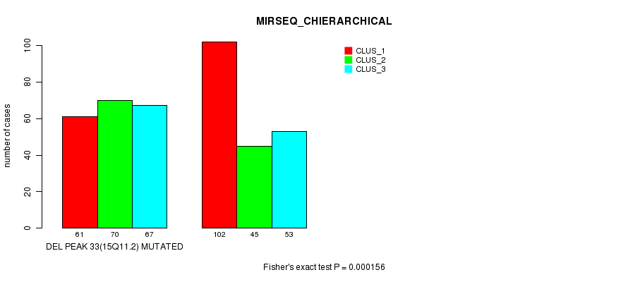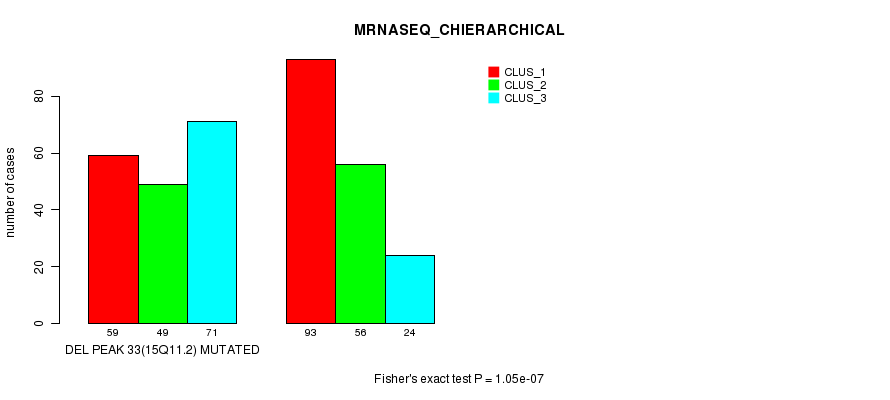 Del Peak 33(15q11.2) cnvs correlated to 'CN_CNMF', 'RPPA_CHIERARCHICAL', 'MRNASEQ_CNMF', 'MRNASEQ_CHIERARCHICAL', and 'MIRSEQ_CHIERARCHICAL'.