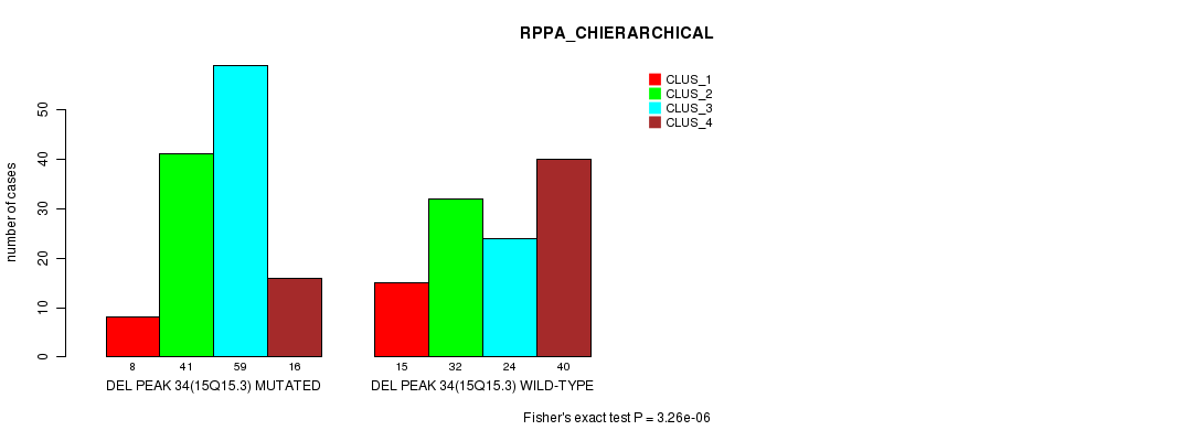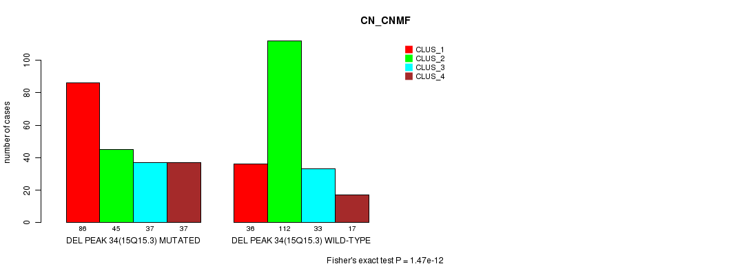 Del Peak 34(15q15.3) cnvs correlated to 'CN_CNMF', 'RPPA_CHIERARCHICAL', 'MRNASEQ_CNMF', 'MRNASEQ_CHIERARCHICAL', 'MIRSEQ_CNMF', and 'MIRSEQ_CHIERARCHICAL'.