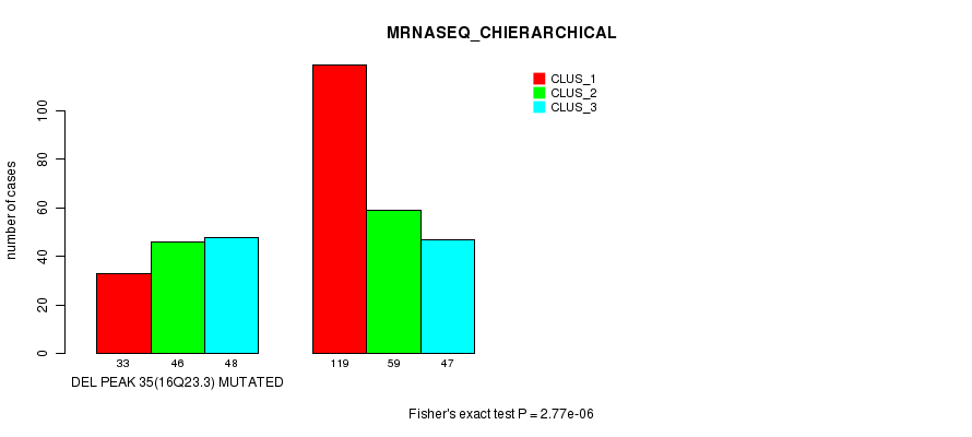 Del Peak 35(16q23.3) cnvs correlated to 'CN_CNMF', 'MRNASEQ_CNMF', and 'MRNASEQ_CHIERARCHICAL'.