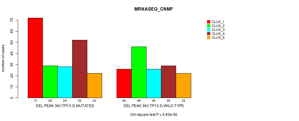 Del Peak 36(17p13.3) cnvs correlated to 'CN_CNMF', 'MRNASEQ_CNMF', and 'MRNASEQ_CHIERARCHICAL'.