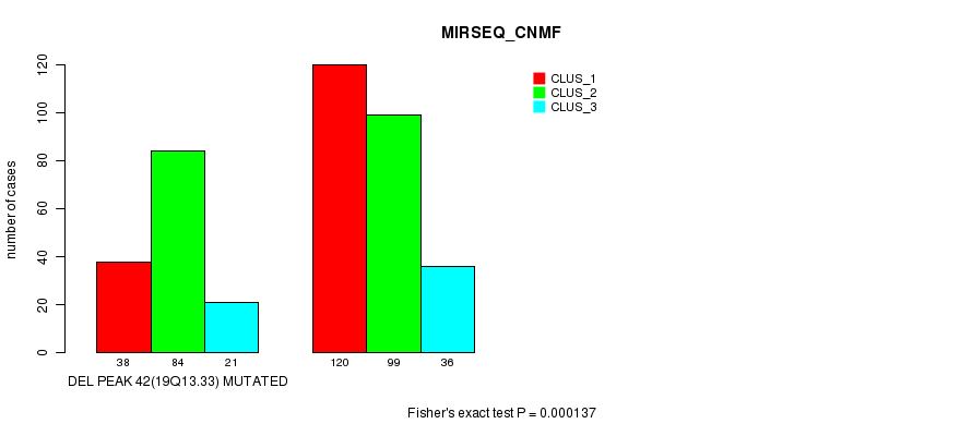Del Peak 42(19q13.33) cnvs correlated to 'CN_CNMF', 'MIRSEQ_CNMF', and 'MIRSEQ_CHIERARCHICAL'.