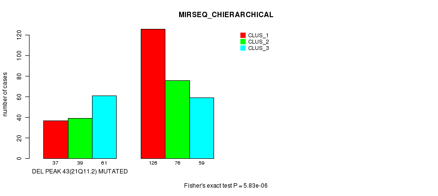 Figure S246. Get High-res Image Gene #75: 'Del Peak 43(21q11.2) mutation analysis' versus Clinical Feature #10: 'MIRSEQ_CHIERARCHICAL'