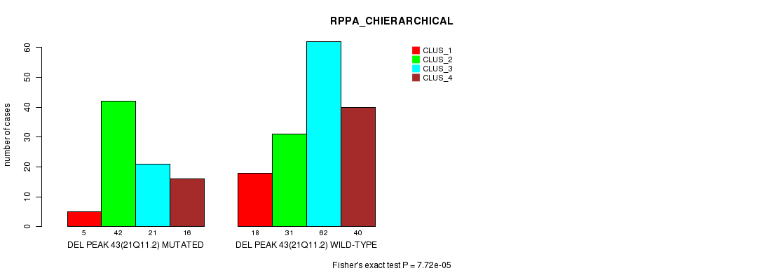 Figure S242. Get High-res Image Gene #75: 'Del Peak 43(21q11.2) mutation analysis' versus Clinical Feature #6: 'RPPA_CHIERARCHICAL'