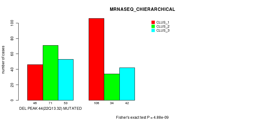 Figure S250. Get High-res Image Gene #76: 'Del Peak 44(22q13.32) mutation analysis' versus Clinical Feature #8: 'MRNASEQ_CHIERARCHICAL'