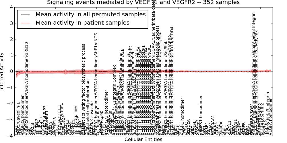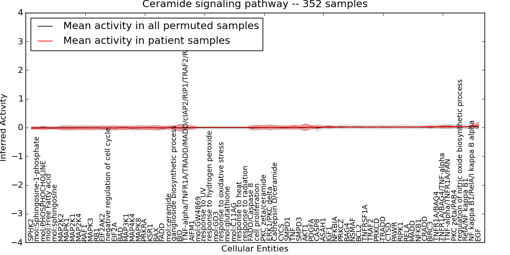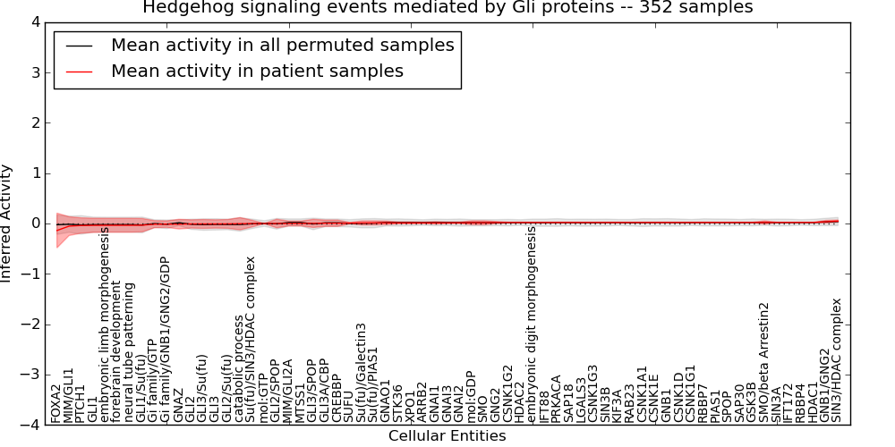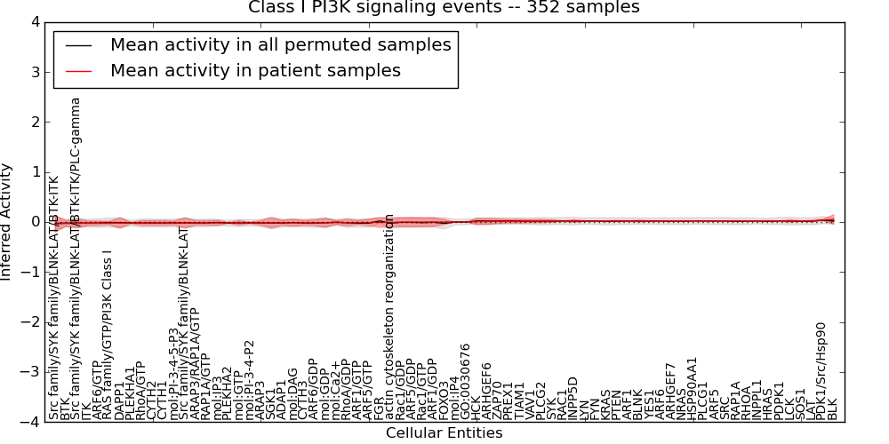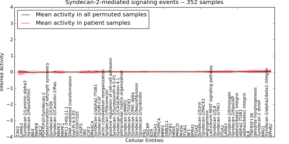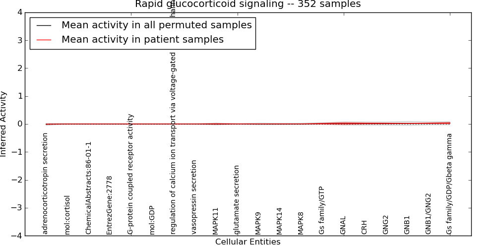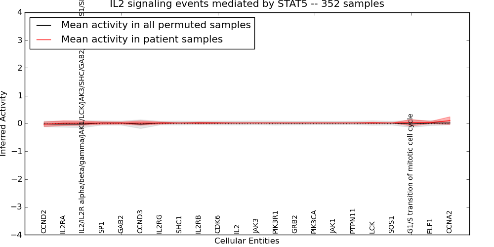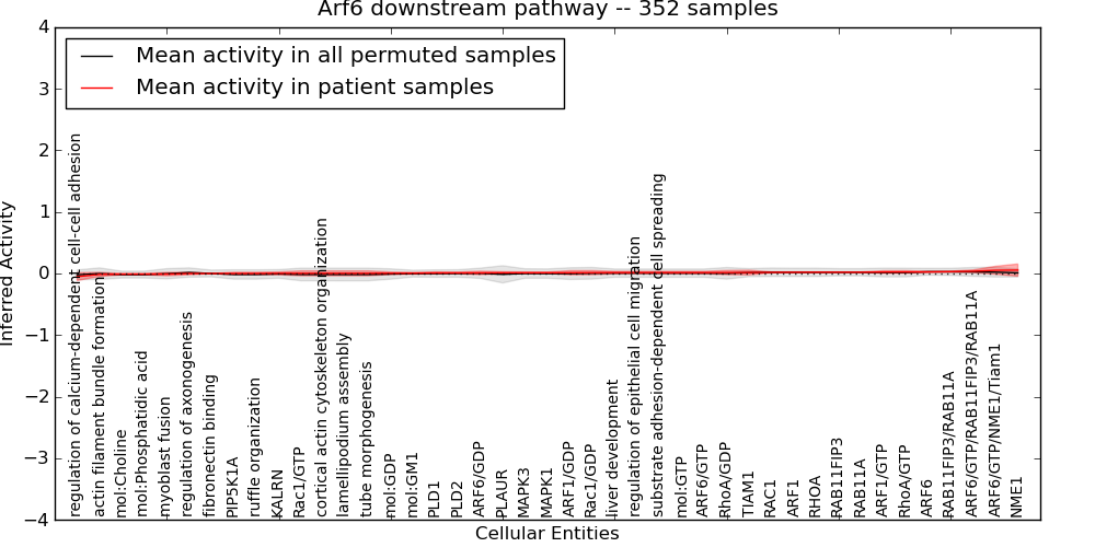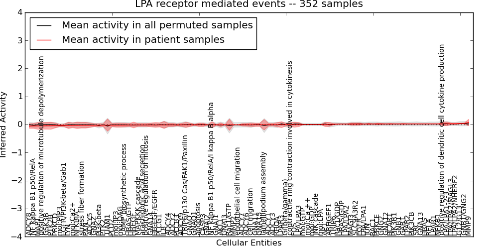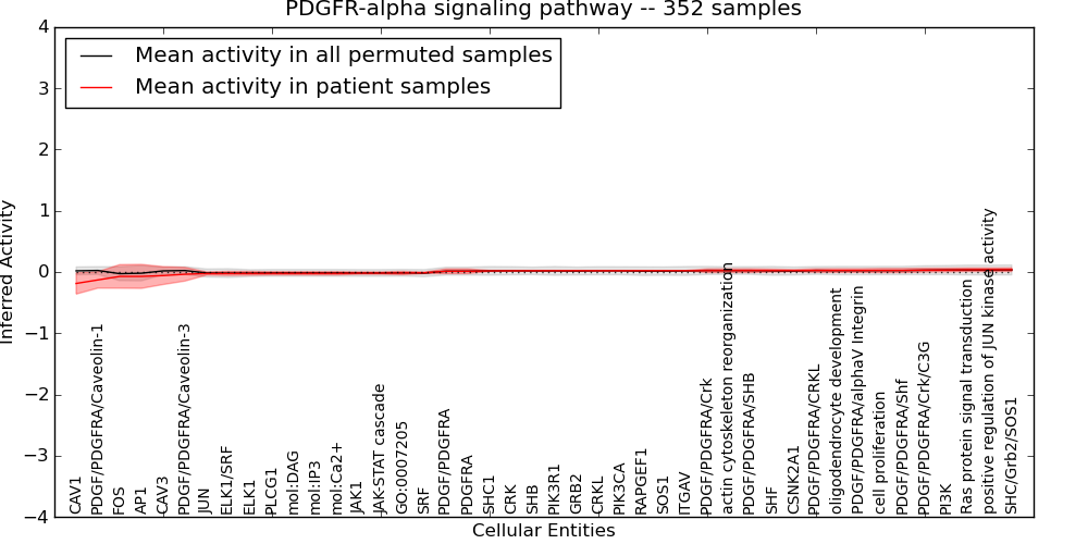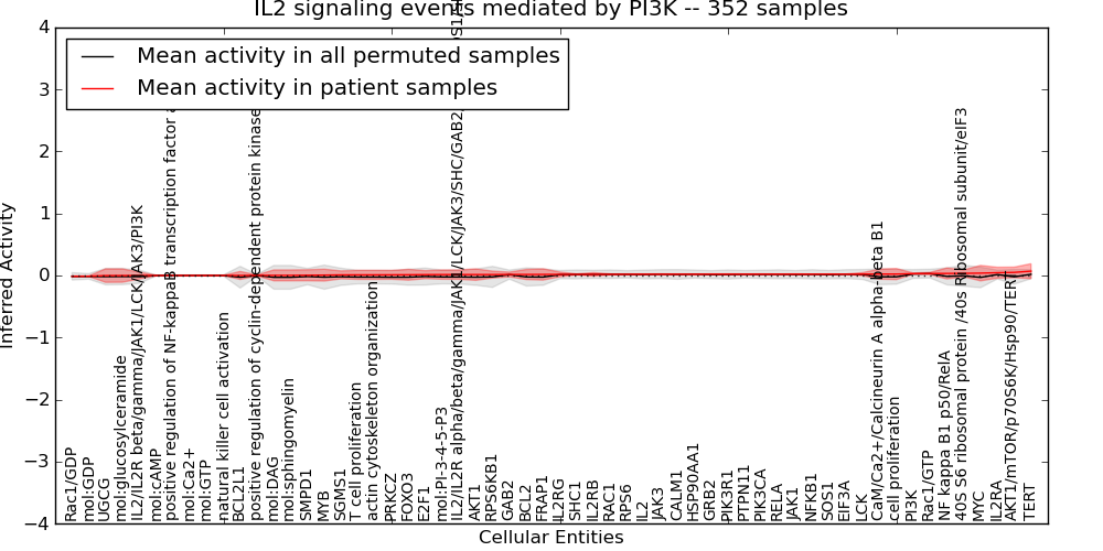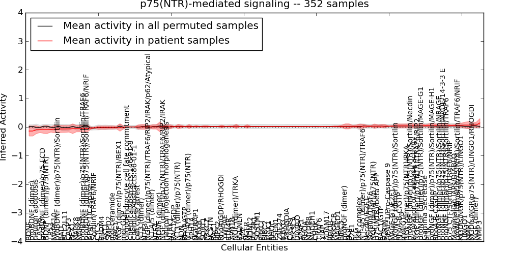 Figure S131. Get High-res Image This plot shows pathway concept perturbations across all samples against a permutation model. The concepts along the x-axis are sorted by lowest to highest mean activity for the real patient samples. Mean inferred activities are plotted along the y-axis as a colored band showing the average level and one standard deviation range. Real samples are shown in red and permuted samples in black.