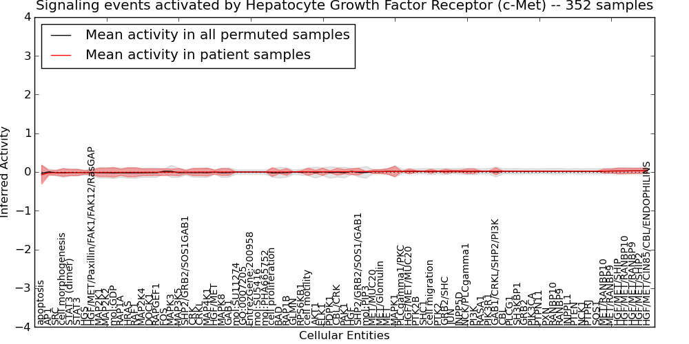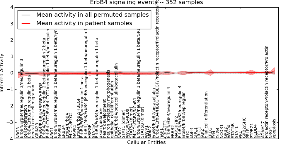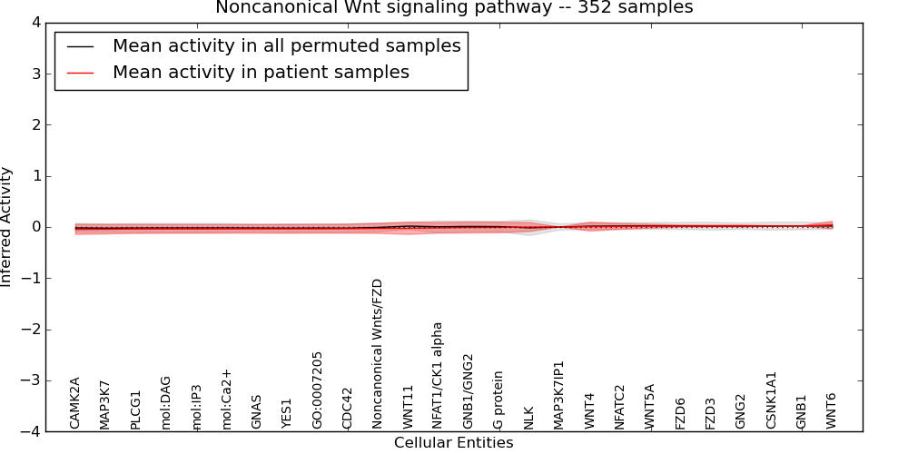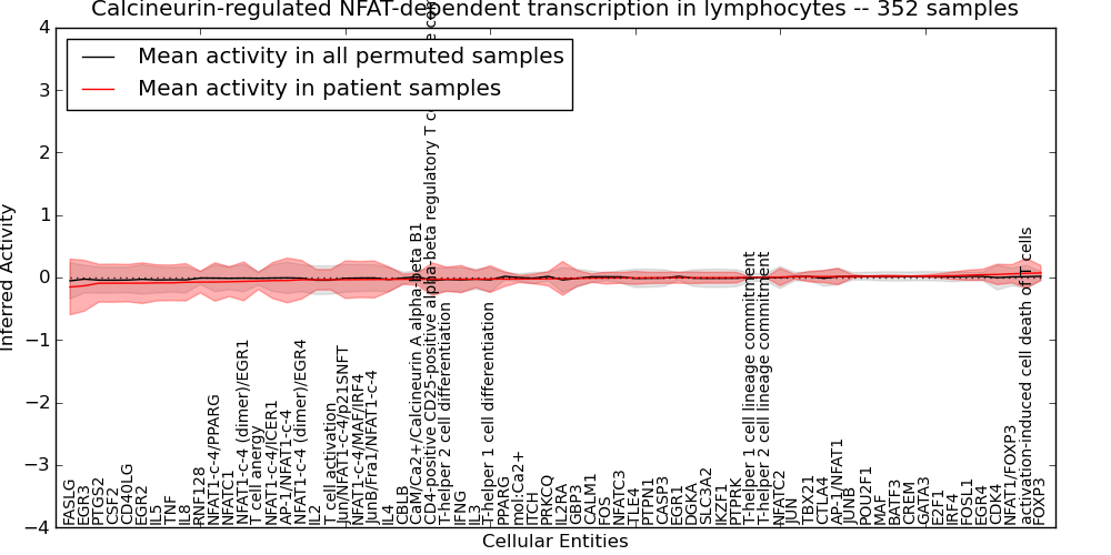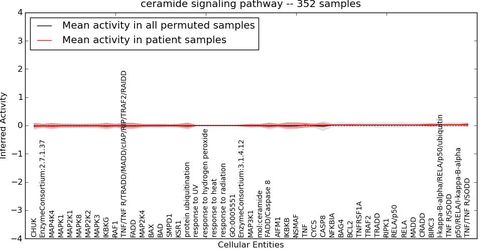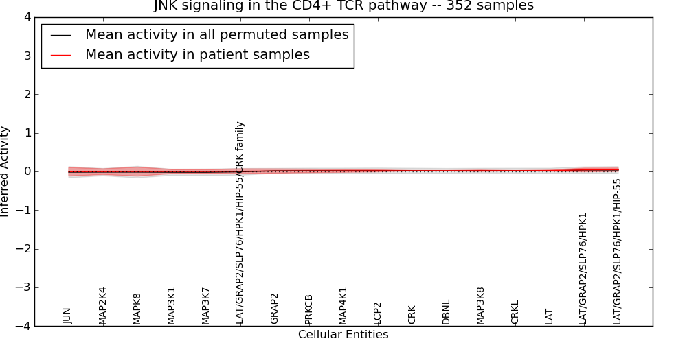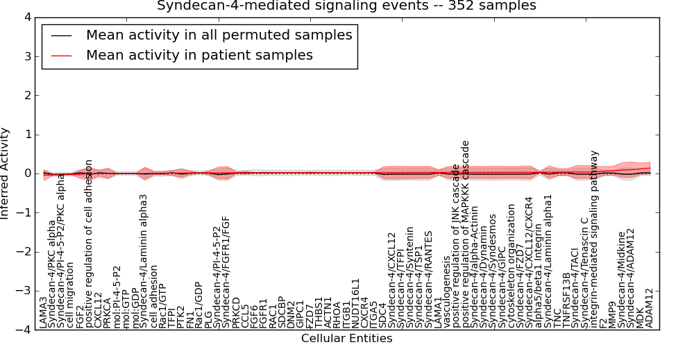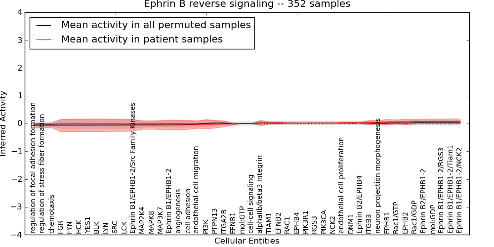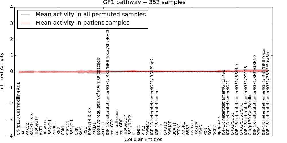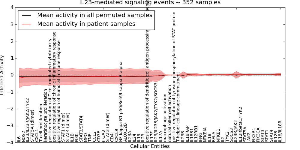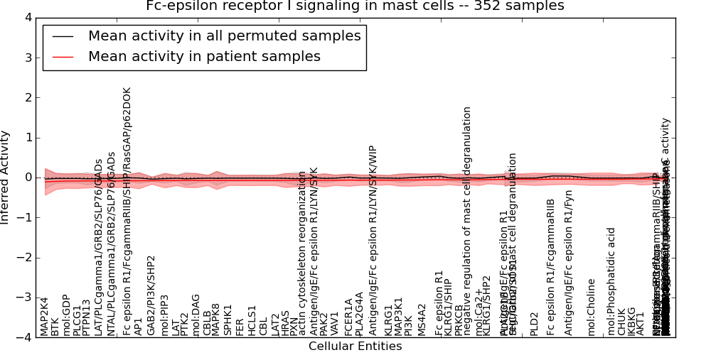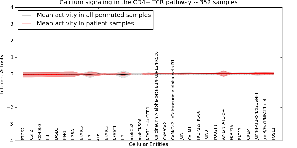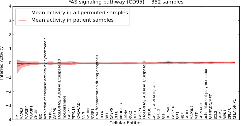 Figure S131. Get High-res Image This plot shows pathway concept perturbations across all samples against a permutation model. The concepts along the x-axis are sorted by lowest to highest mean activity for the real patient samples. Mean inferred activities are plotted along the y-axis as a colored band showing the average level and one standard deviation range. Real samples are shown in red and permuted samples in black.