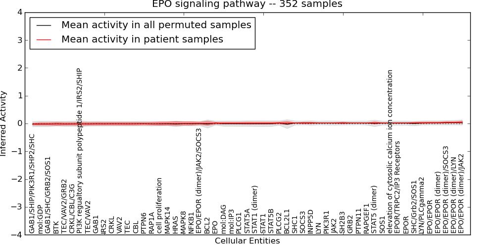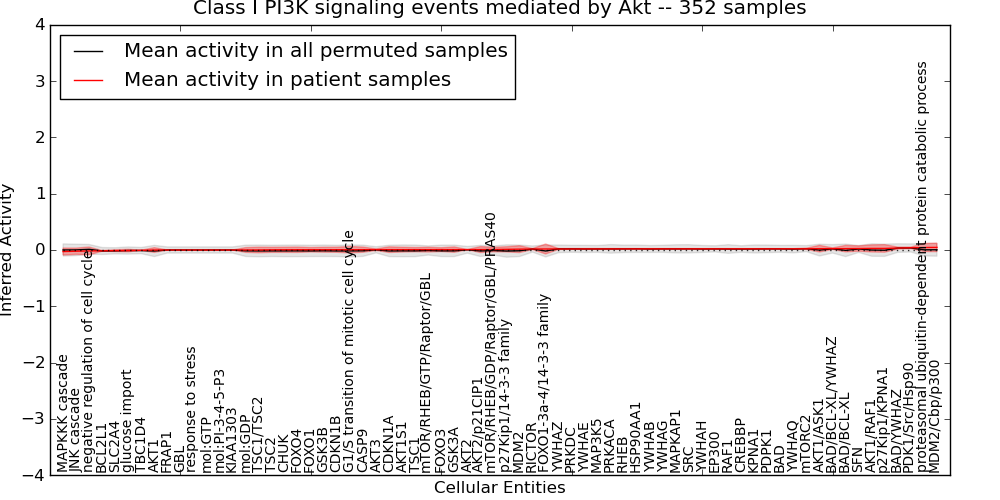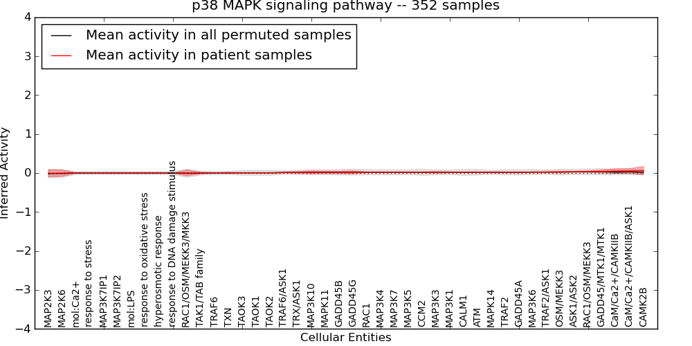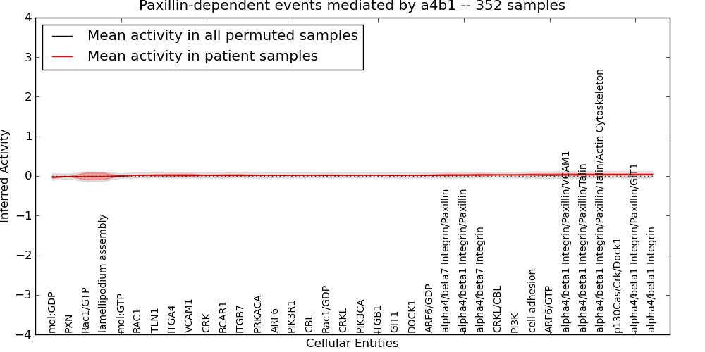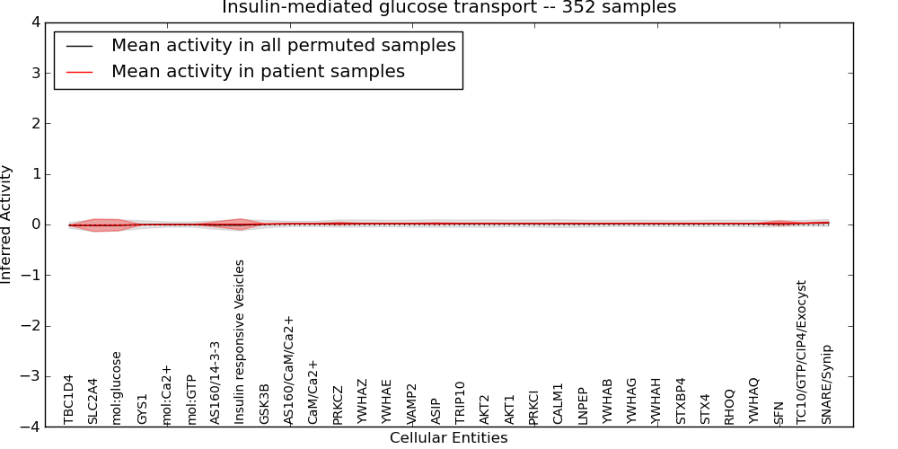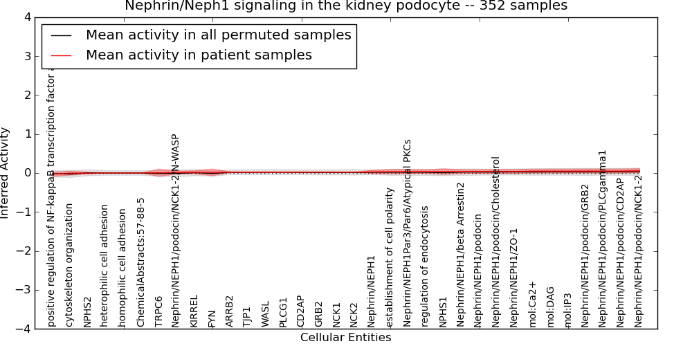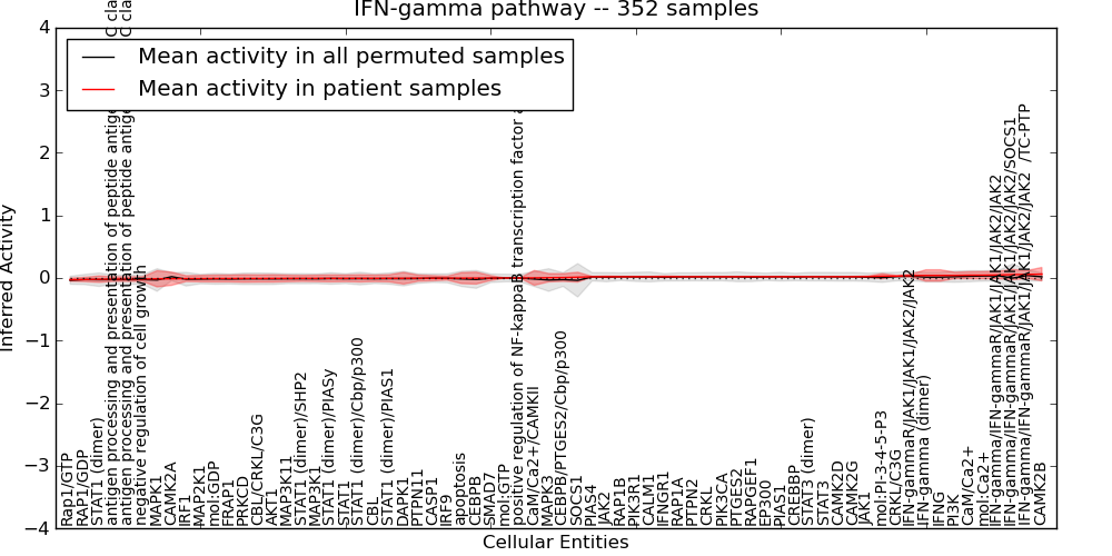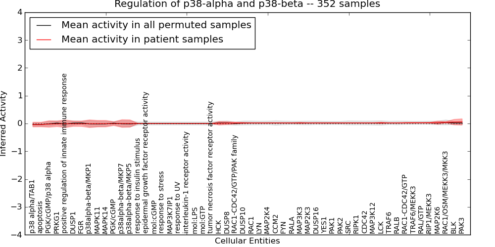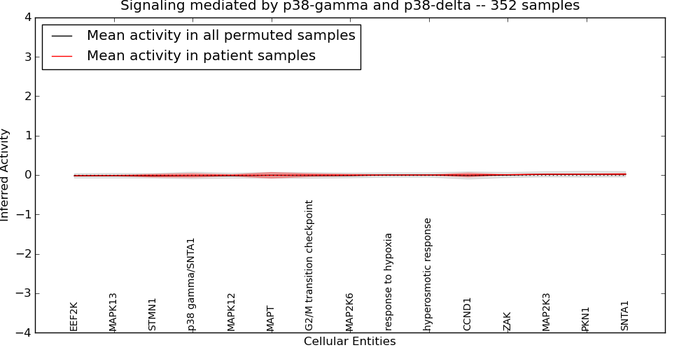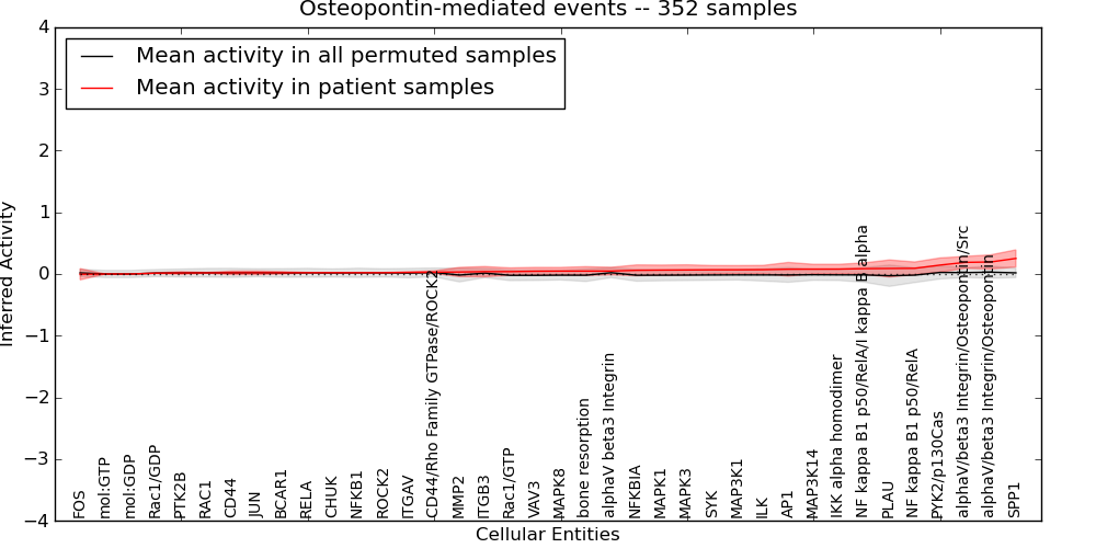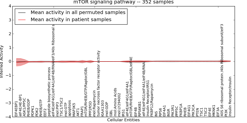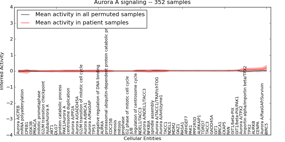 Figure S131. Get High-res Image This plot shows pathway concept perturbations across all samples against a permutation model. The concepts along the x-axis are sorted by lowest to highest mean activity for the real patient samples. Mean inferred activities are plotted along the y-axis as a colored band showing the average level and one standard deviation range. Real samples are shown in red and permuted samples in black.