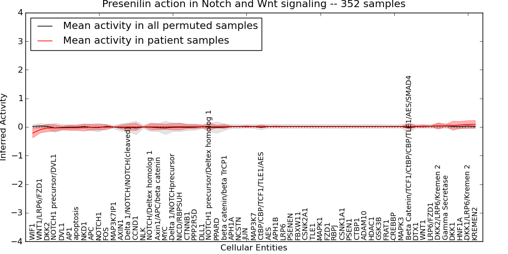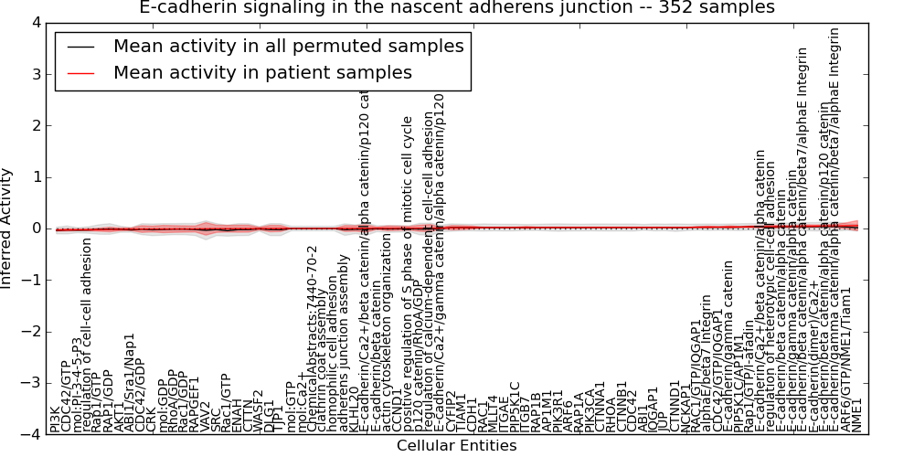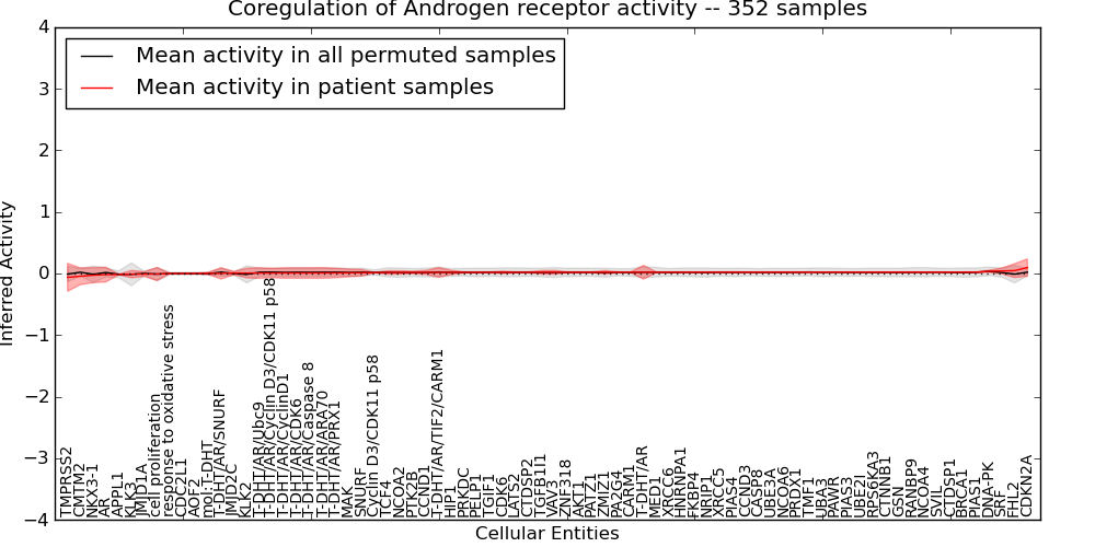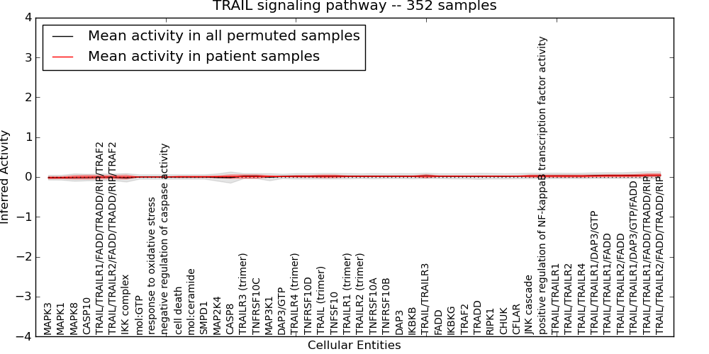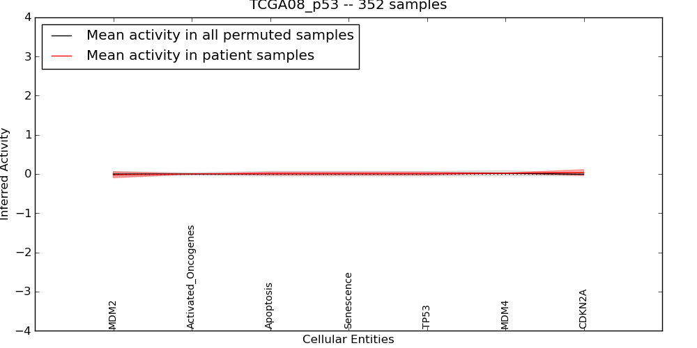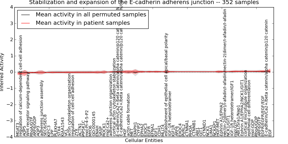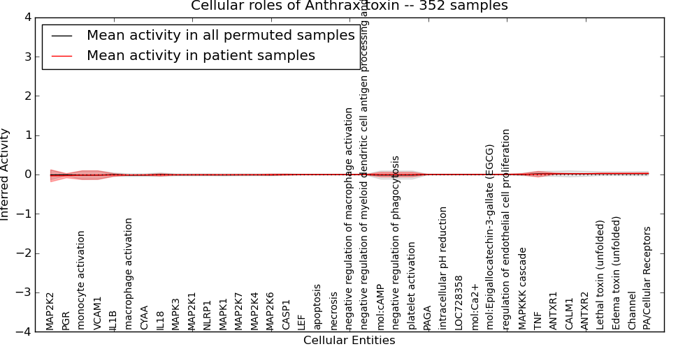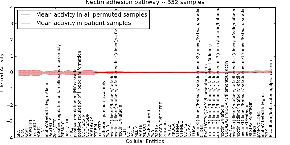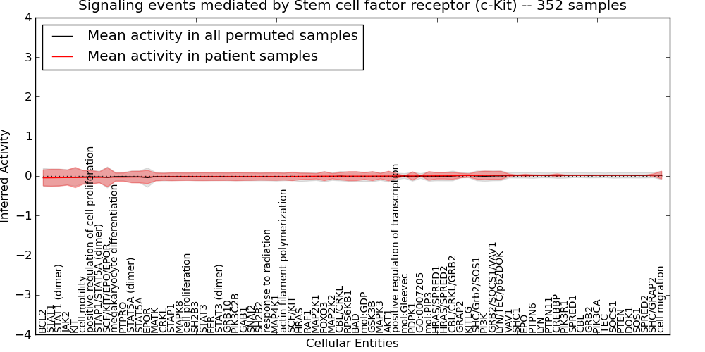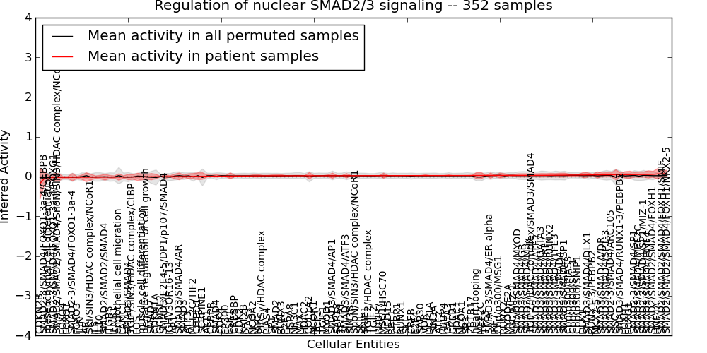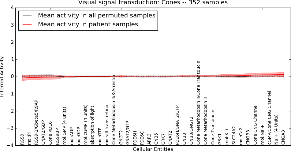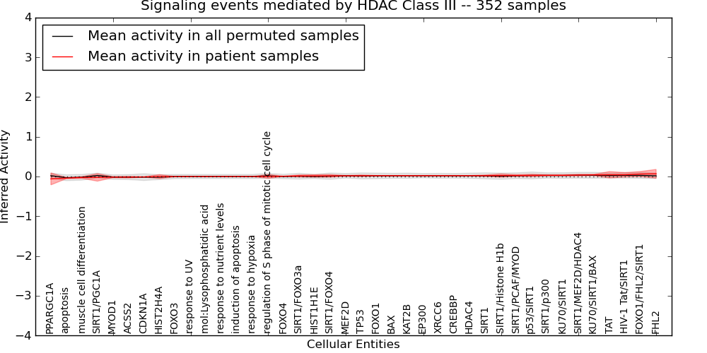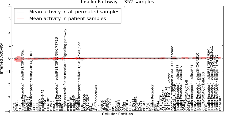 Figure S131. Get High-res Image This plot shows pathway concept perturbations across all samples against a permutation model. The concepts along the x-axis are sorted by lowest to highest mean activity for the real patient samples. Mean inferred activities are plotted along the y-axis as a colored band showing the average level and one standard deviation range. Real samples are shown in red and permuted samples in black.