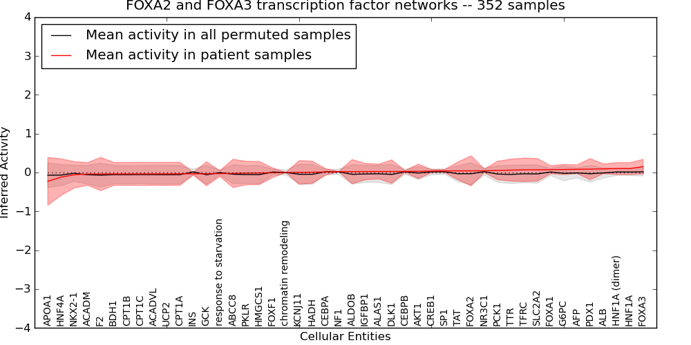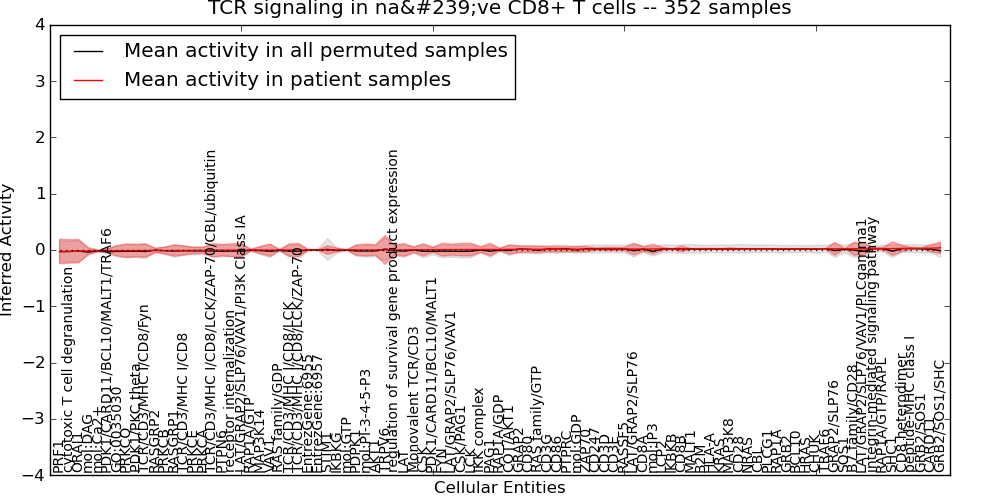 Figure S130. Get High-res Image This plot shows pathway concept perturbations across all samples against a permutation model. The concepts along the x-axis are sorted by lowest to highest mean activity for the real patient samples. Mean inferred activities are plotted along the y-axis as a colored band showing the average level and one standard deviation range. Real samples are shown in red and permuted samples in black.