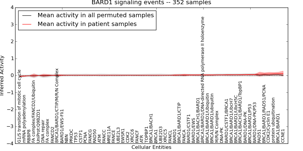 Figure S129. Get High-res Image This plot shows pathway concept perturbations across all samples against a permutation model. The concepts along the x-axis are sorted by lowest to highest mean activity for the real patient samples. Mean inferred activities are plotted along the y-axis as a colored band showing the average level and one standard deviation range. Real samples are shown in red and permuted samples in black.