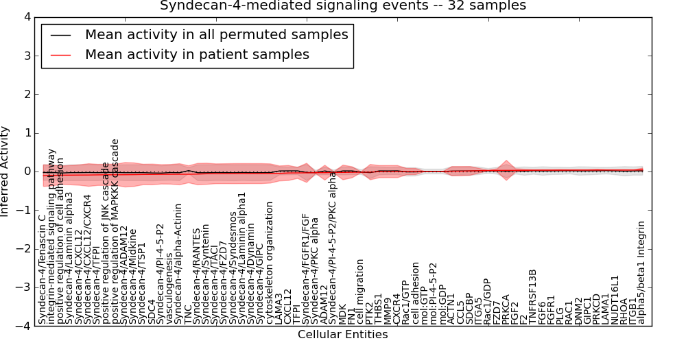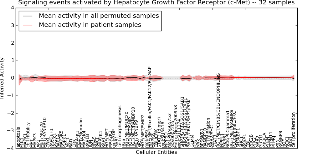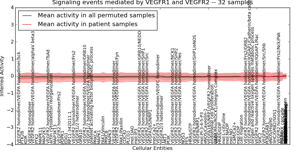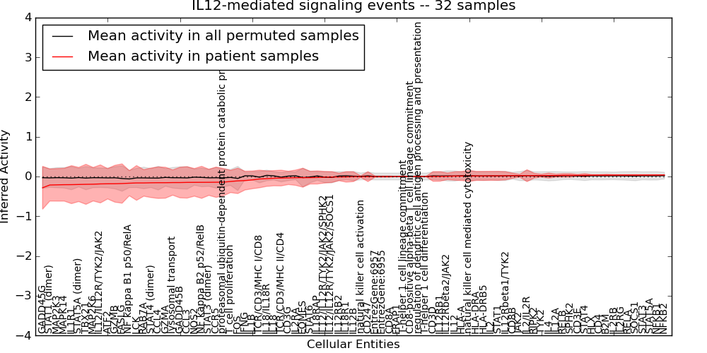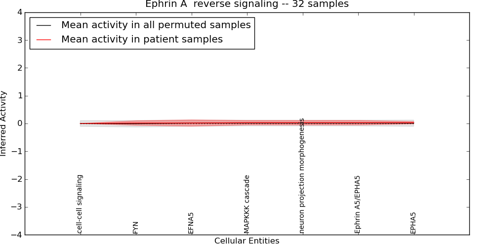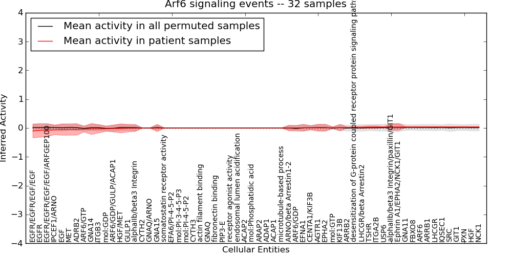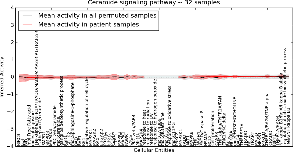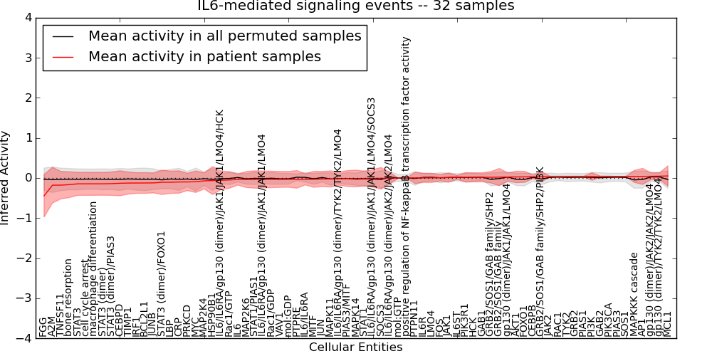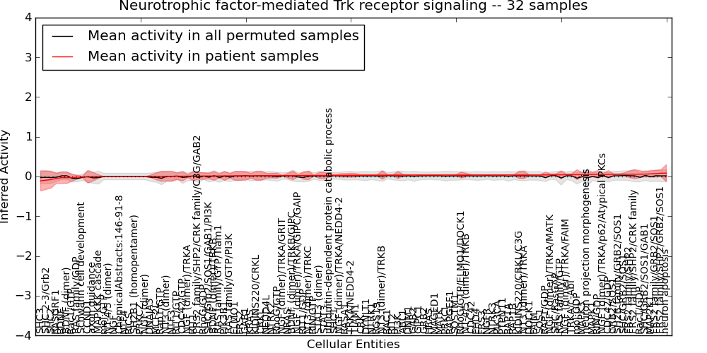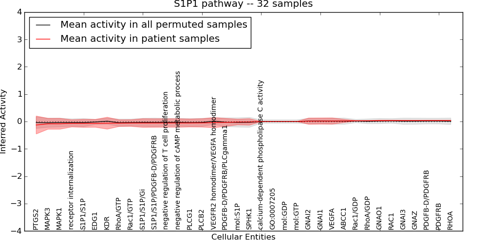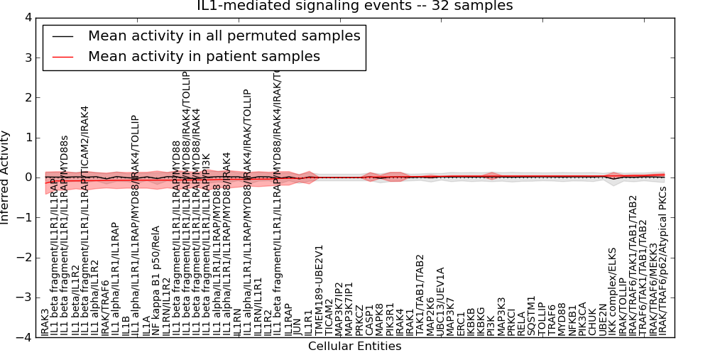 Figure S131. Get High-res Image This plot shows pathway concept perturbations across all samples against a permutation model. The concepts along the x-axis are sorted by lowest to highest mean activity for the real patient samples. Mean inferred activities are plotted along the y-axis as a colored band showing the average level and one standard deviation range. Real samples are shown in red and permuted samples in black.