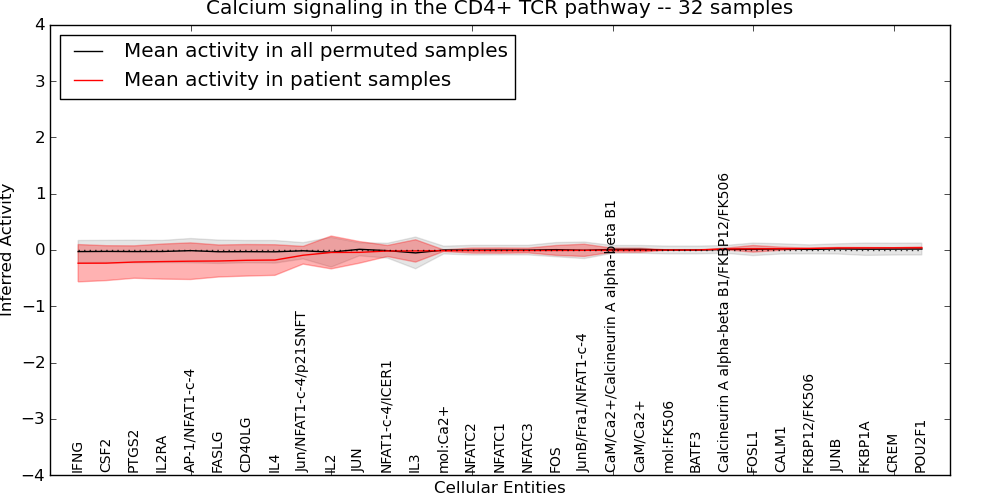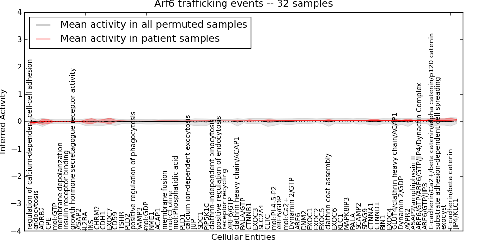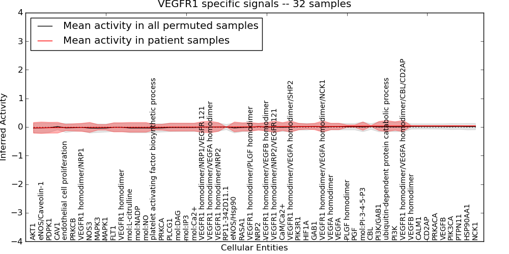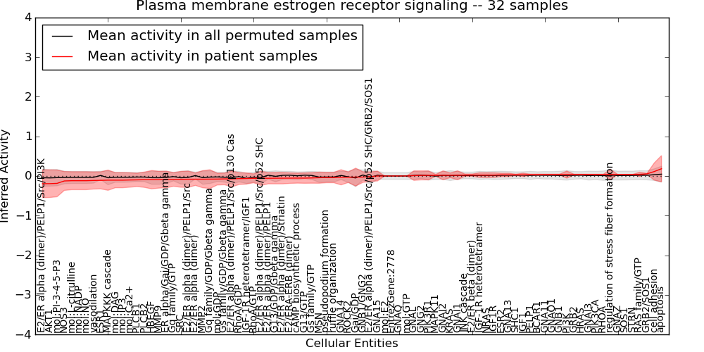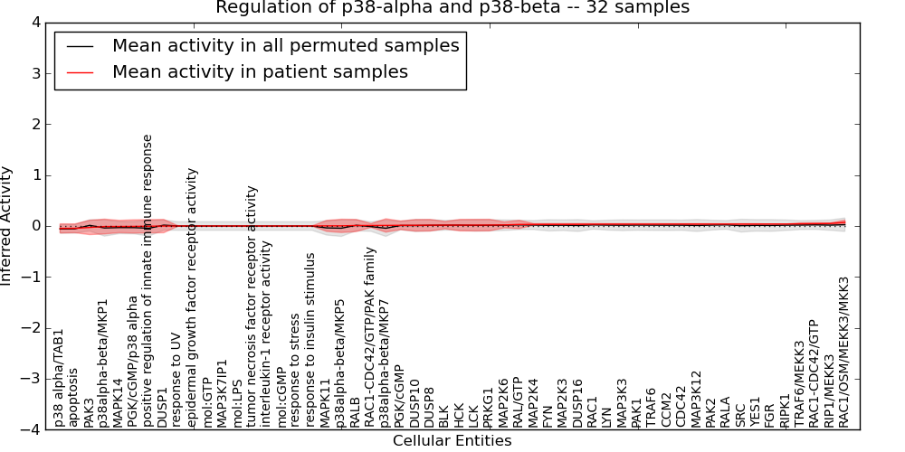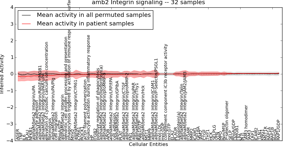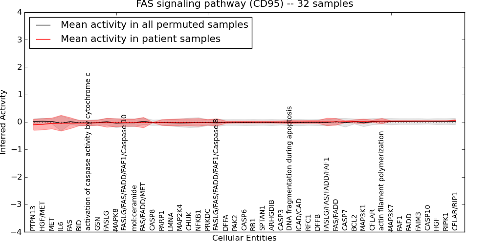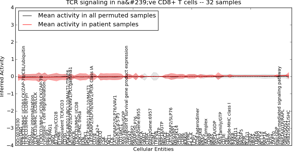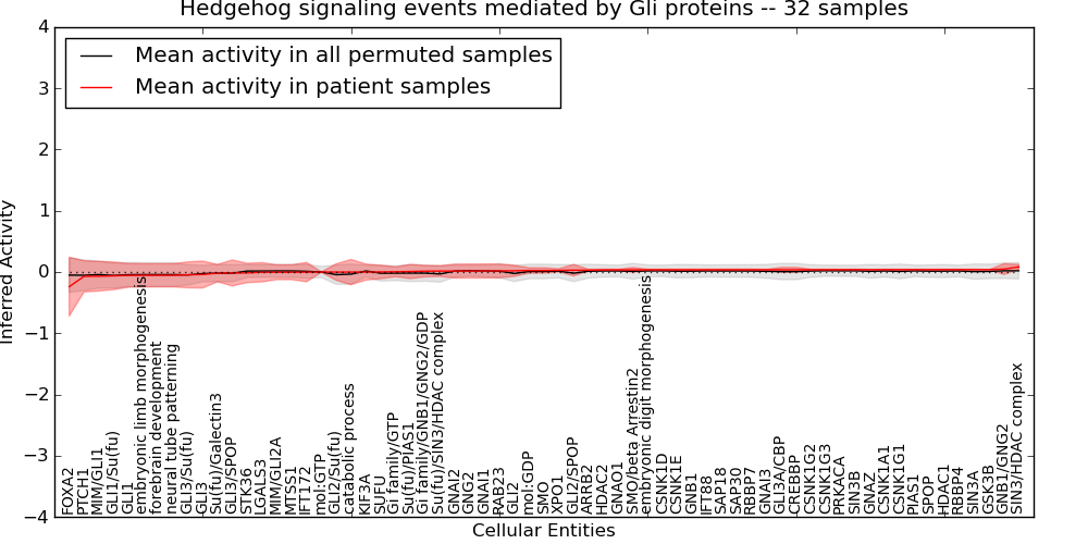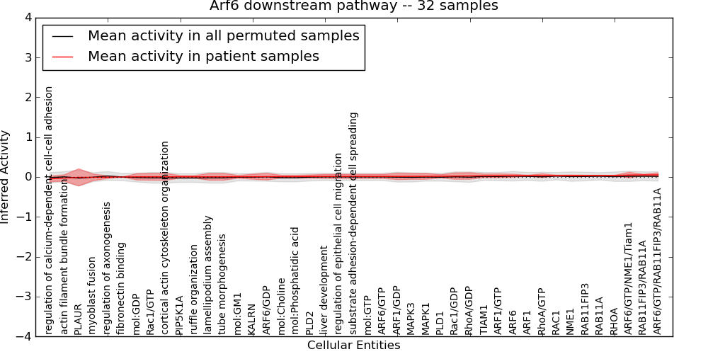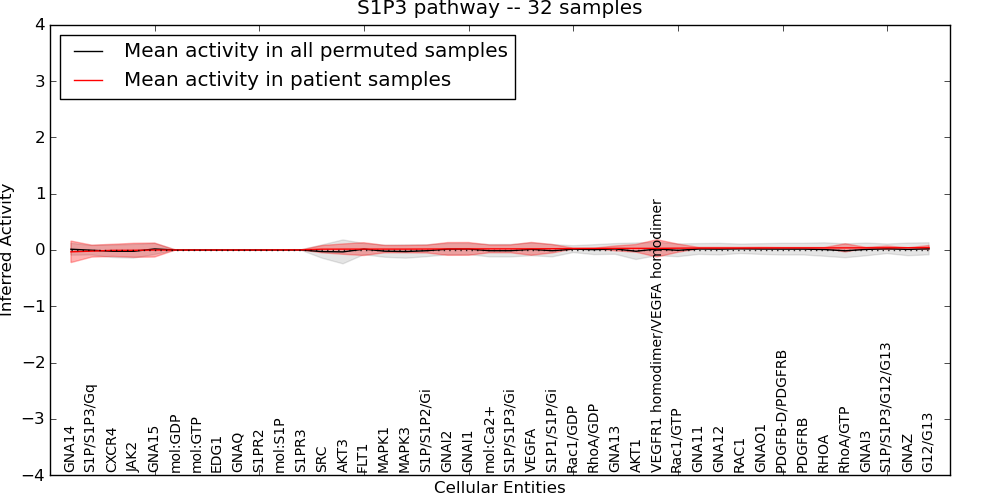 Figure S131. Get High-res Image This plot shows pathway concept perturbations across all samples against a permutation model. The concepts along the x-axis are sorted by lowest to highest mean activity for the real patient samples. Mean inferred activities are plotted along the y-axis as a colored band showing the average level and one standard deviation range. Real samples are shown in red and permuted samples in black.