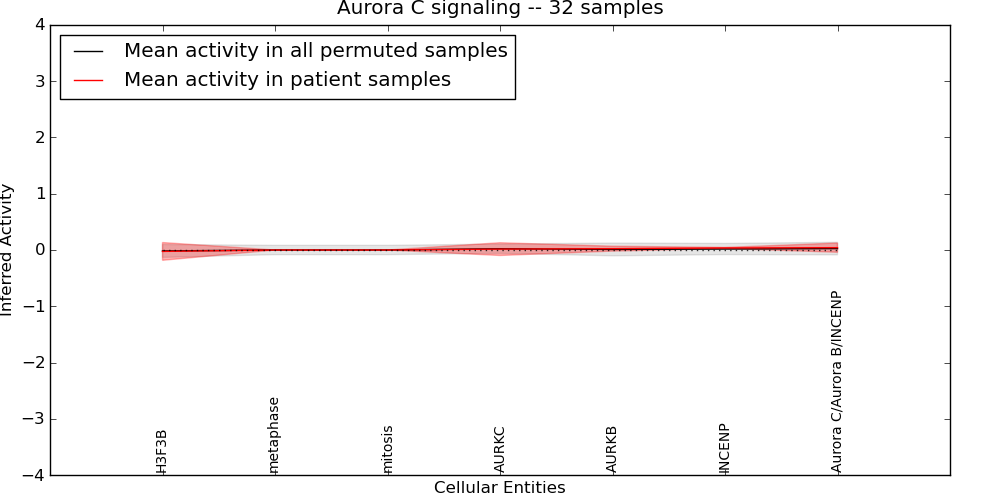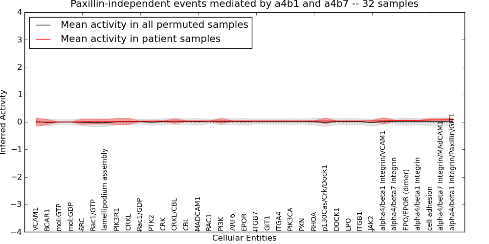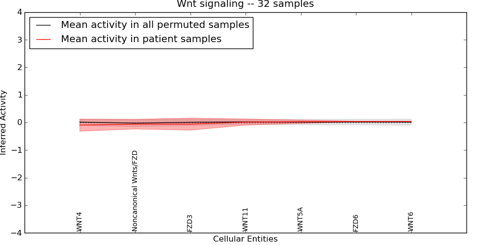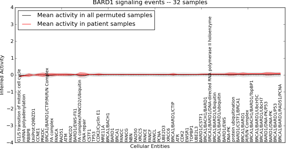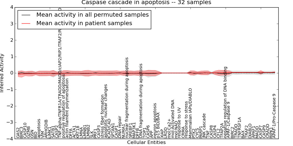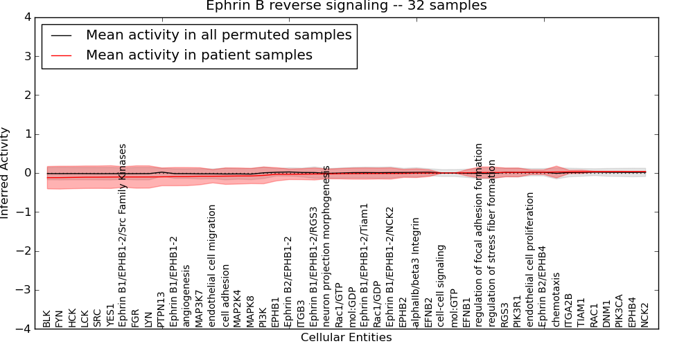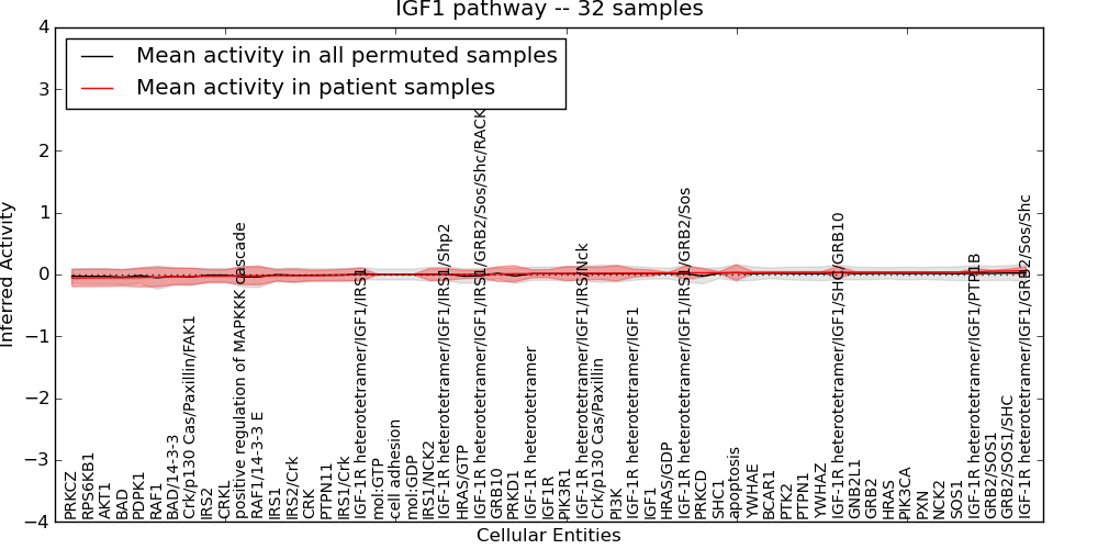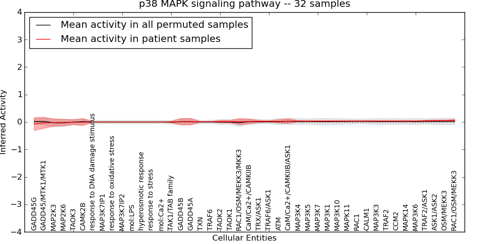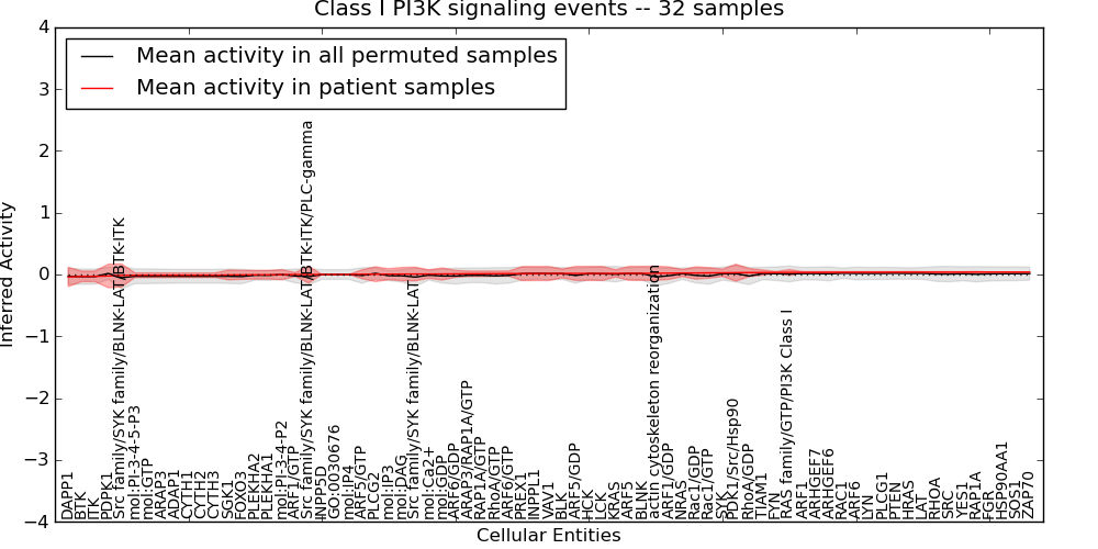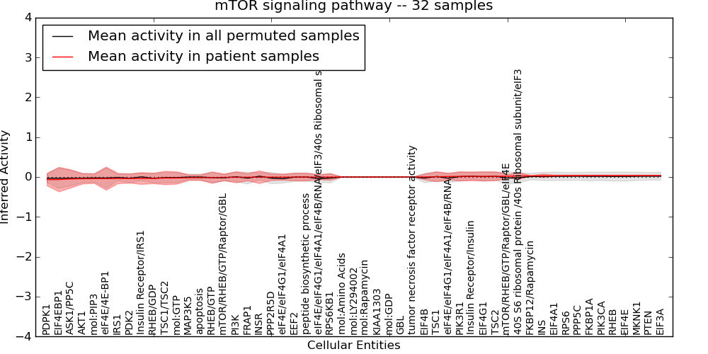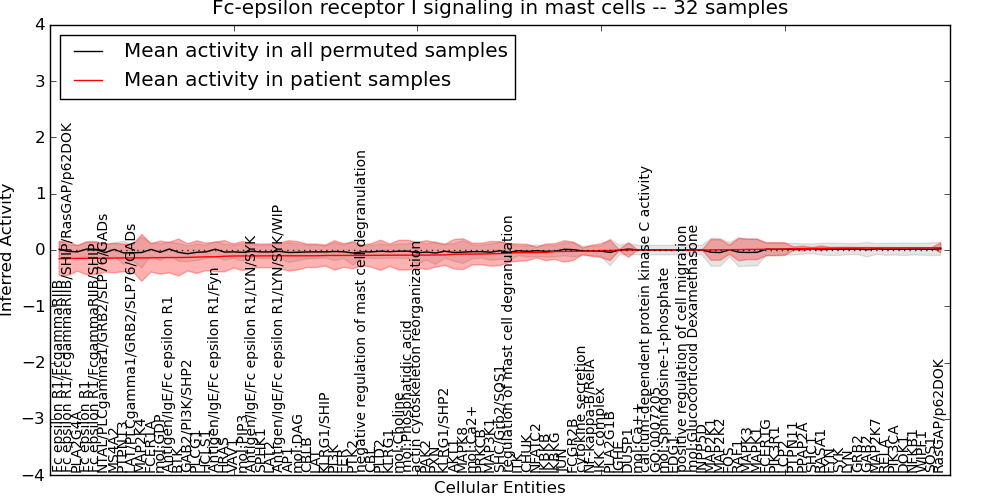 Figure S131. Get High-res Image This plot shows pathway concept perturbations across all samples against a permutation model. The concepts along the x-axis are sorted by lowest to highest mean activity for the real patient samples. Mean inferred activities are plotted along the y-axis as a colored band showing the average level and one standard deviation range. Real samples are shown in red and permuted samples in black.