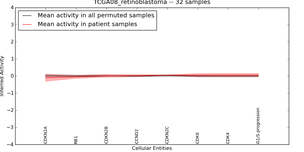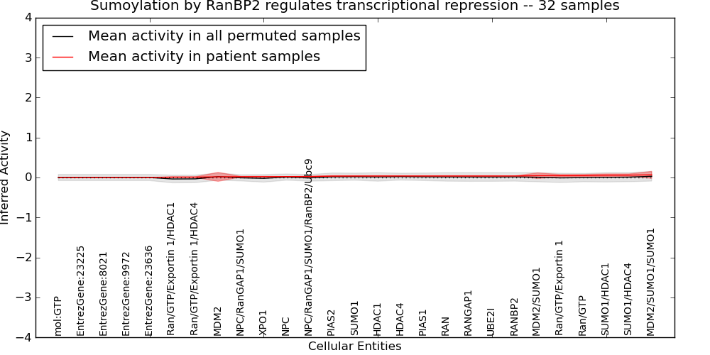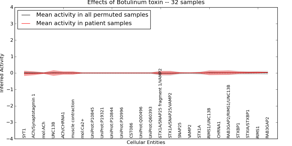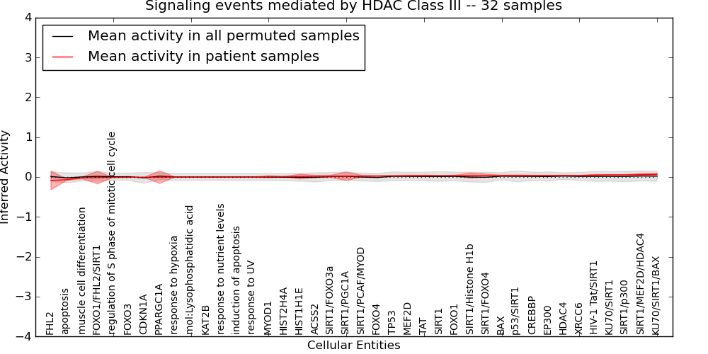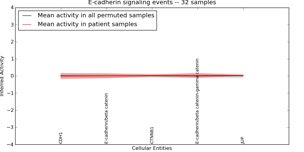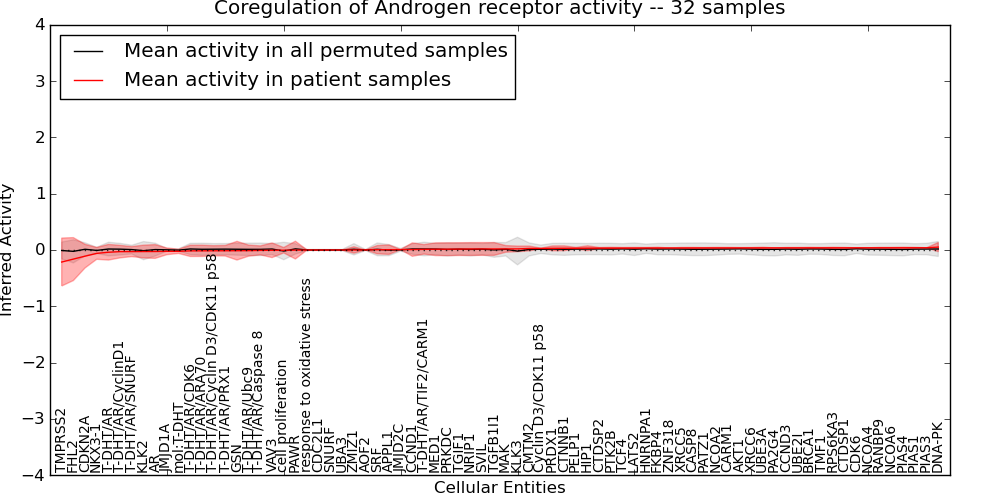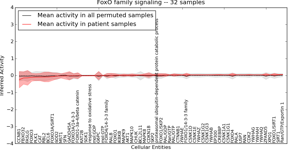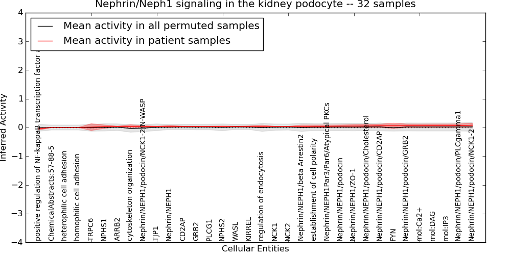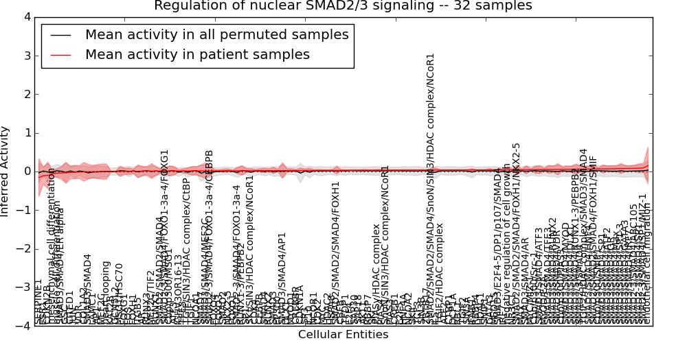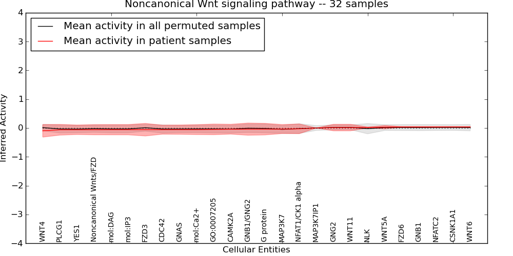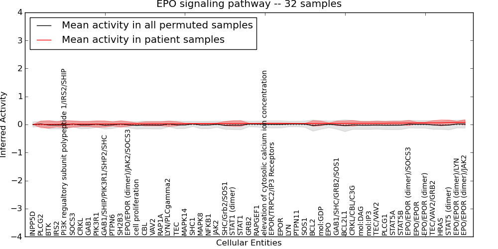 Figure S131. Get High-res Image This plot shows pathway concept perturbations across all samples against a permutation model. The concepts along the x-axis are sorted by lowest to highest mean activity for the real patient samples. Mean inferred activities are plotted along the y-axis as a colored band showing the average level and one standard deviation range. Real samples are shown in red and permuted samples in black.