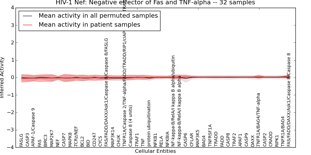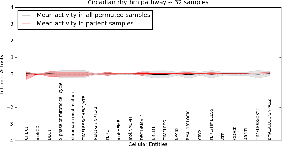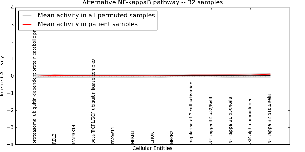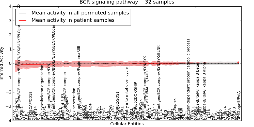 Figure S130. Get High-res Image This plot shows pathway concept perturbations across all samples against a permutation model. The concepts along the x-axis are sorted by lowest to highest mean activity for the real patient samples. Mean inferred activities are plotted along the y-axis as a colored band showing the average level and one standard deviation range. Real samples are shown in red and permuted samples in black.