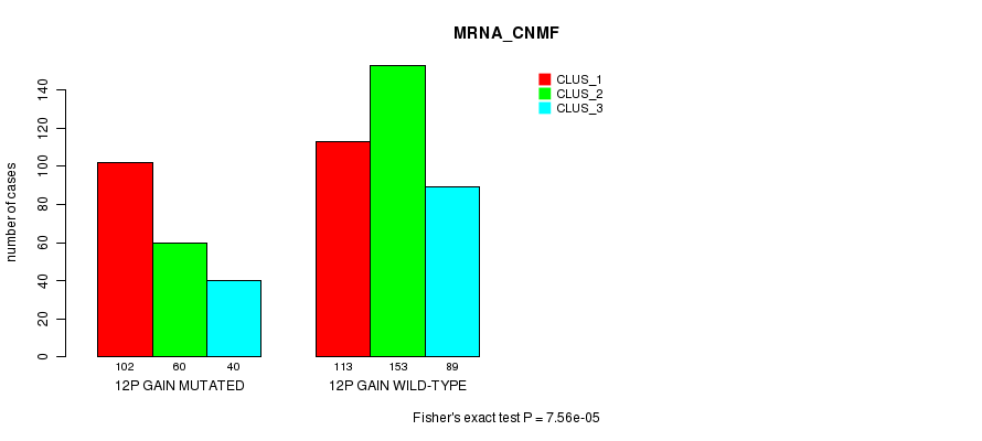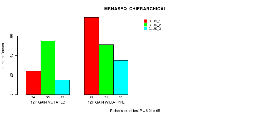 12p gain cnv correlated to 'MRNA_CNMF', 'MRNA_CHIERARCHICAL', 'MIR_CHIERARCHICAL', 'CN_CNMF', 'METHLYATION_CNMF', 'MRNASEQ_CNMF', and 'MRNASEQ_CHIERARCHICAL'.