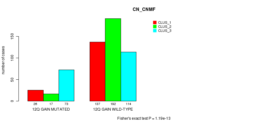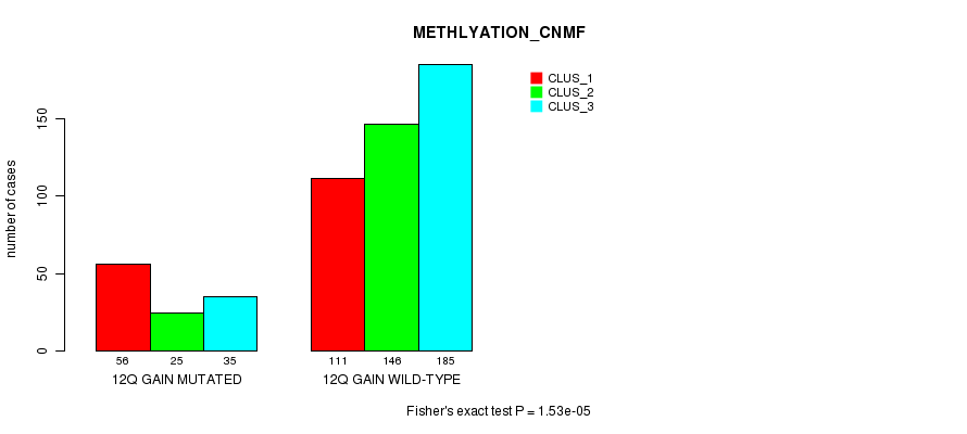 12q gain cnv correlated to 'MRNA_CHIERARCHICAL', 'CN_CNMF', and 'METHLYATION_CNMF'.