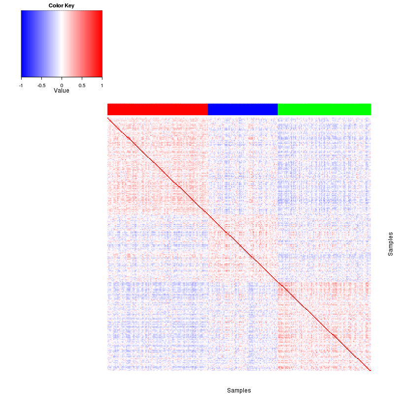 Figure 1. Get High-res Image Samples were separated into 3 clusters. Shown are 262 samples and 900 marker genes. The color bar of the row indicates the marker genes for the corresponding cluster.
