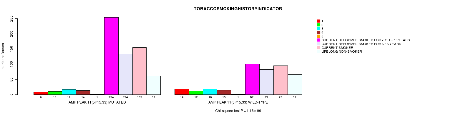 2 subtypes identified in current cancer cohort by 'Amp Peak 11(5p15.33) mutation analysis'. These subtypes correlate to 'AGE', 'PRIMARY.SITE.OF.DISEASE', 'KARNOFSKY.PERFORMANCE.SCORE', 'HISTOLOGICAL.TYPE', 'PATHOLOGY.T', 'TUMOR.STAGE', 'RADIATIONS.RADIATION.REGIMENINDICATION', and 'TOBACCOSMOKINGHISTORYINDICATOR'.