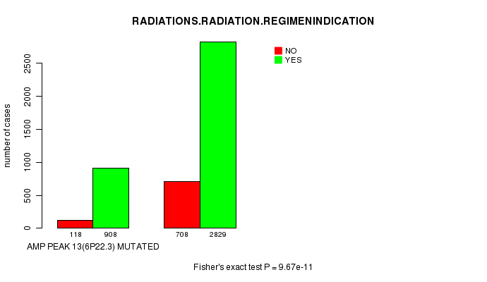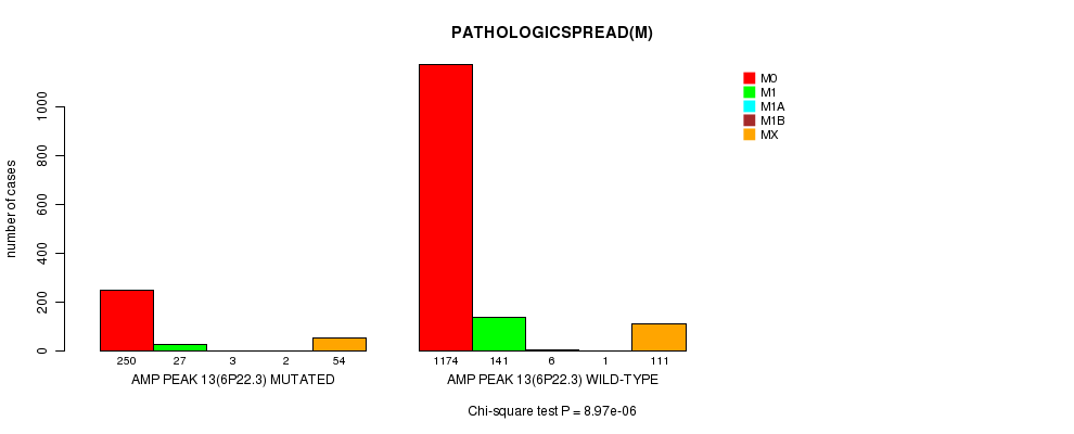 2 subtypes identified in current cancer cohort by 'Amp Peak 13(6p22.3) mutation analysis'. These subtypes correlate to 'PRIMARY.SITE.OF.DISEASE', 'GENDER', 'HISTOLOGICAL.TYPE', 'PATHOLOGICSPREAD(M)', 'TUMOR.STAGE', and 'RADIATIONS.RADIATION.REGIMENINDICATION'.