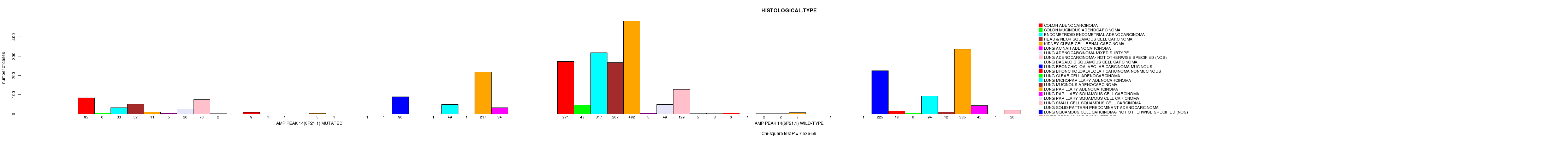 2 subtypes identified in current cancer cohort by 'Amp Peak 14(6p21.1) mutation analysis'. These subtypes correlate to 'PRIMARY.SITE.OF.DISEASE', 'GENDER', 'HISTOLOGICAL.TYPE', 'PATHOLOGICSPREAD(M)', 'TUMOR.STAGE', and 'RADIATIONS.RADIATION.REGIMENINDICATION'.