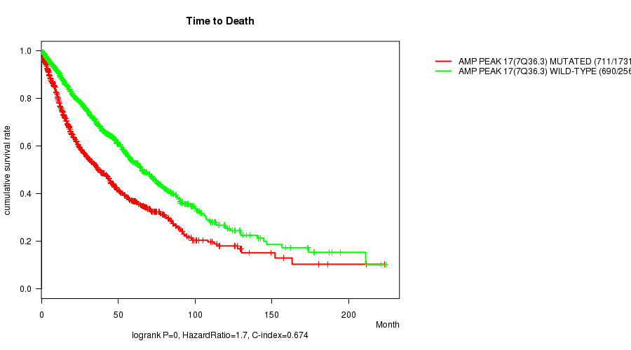 2 subtypes identified in current cancer cohort by 'Amp Peak 17(7q36.3) mutation analysis'. These subtypes correlate to 'Time to Death', 'PRIMARY.SITE.OF.DISEASE', 'GENDER', 'HISTOLOGICAL.TYPE', 'TUMOR.STAGE', and 'RADIATIONS.RADIATION.REGIMENINDICATION'.