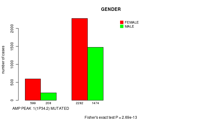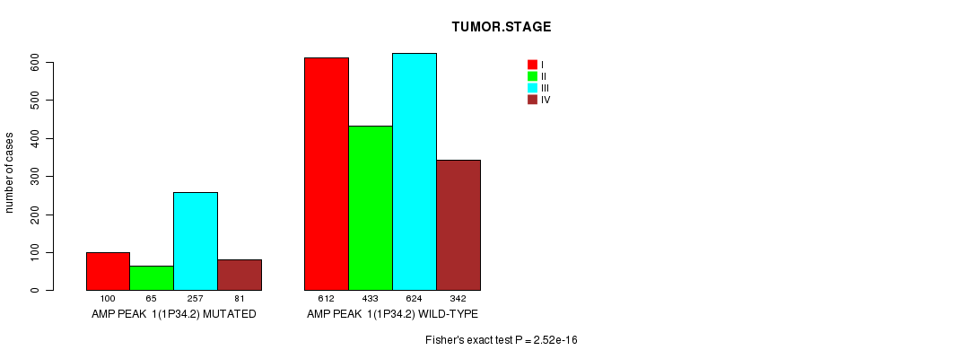 2 subtypes identified in current cancer cohort by 'Amp Peak 1(1p34.2) mutation analysis'. These subtypes correlate to 'PRIMARY.SITE.OF.DISEASE', 'GENDER', 'HISTOLOGICAL.TYPE', 'PATHOLOGY.T', and 'TUMOR.STAGE'.