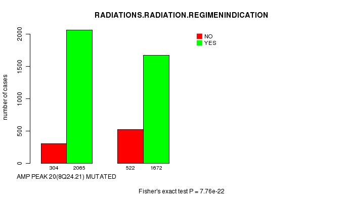 2 subtypes identified in current cancer cohort by 'Amp Peak 20(8q24.21) mutation analysis'. These subtypes correlate to 'PRIMARY.SITE.OF.DISEASE', 'GENDER', 'KARNOFSKY.PERFORMANCE.SCORE', 'HISTOLOGICAL.TYPE', 'PATHOLOGY.T', 'PATHOLOGY.N', 'TUMOR.STAGE', and 'RADIATIONS.RADIATION.REGIMENINDICATION'.