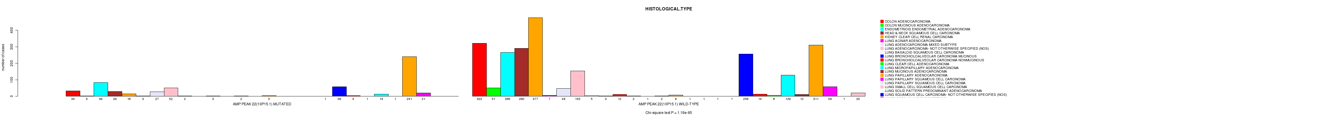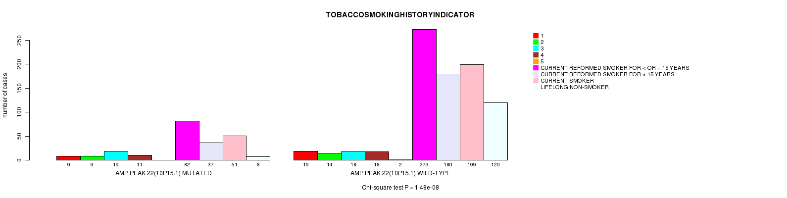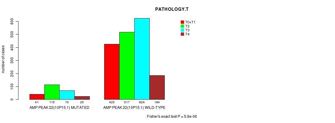 2 subtypes identified in current cancer cohort by 'Amp Peak 22(10p15.1) mutation analysis'. These subtypes correlate to 'PRIMARY.SITE.OF.DISEASE', 'GENDER', 'HISTOLOGICAL.TYPE', 'PATHOLOGY.T', 'TUMOR.STAGE', 'RADIATIONS.RADIATION.REGIMENINDICATION', and 'TOBACCOSMOKINGHISTORYINDICATOR'.