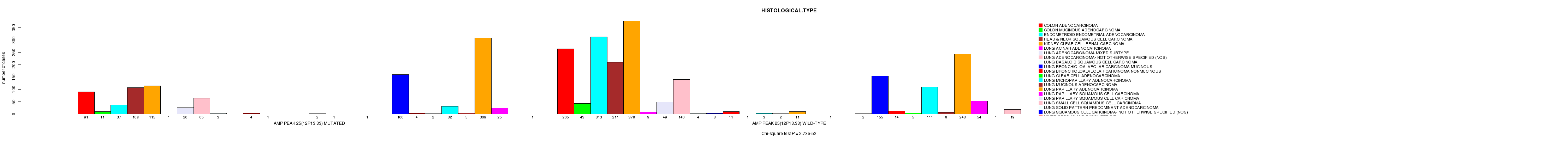 2 subtypes identified in current cancer cohort by 'Amp Peak 25(12p13.33) mutation analysis'. These subtypes correlate to 'PRIMARY.SITE.OF.DISEASE', 'HISTOLOGICAL.TYPE', 'PATHOLOGY.T', 'TUMOR.STAGE', and 'RADIATIONS.RADIATION.REGIMENINDICATION'.
